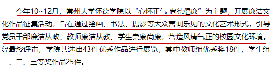 今年10~12月,常州大学怀德学院以“心怀正气 尚德倡廉”为主题,开展廉洁文化作品征集活动,旨在通过绘画、书法、摄影等大众喜闻乐见的文化艺术形式,引导党员干部廉洁从政、教师廉洁从教、学生崇廉尚廉,营造风清气正的校园文化环境。经最终评审,学院共选出43件优秀作品进行展览,其中教师组优秀奖18件,学生组一、二、三等奖作品25件。