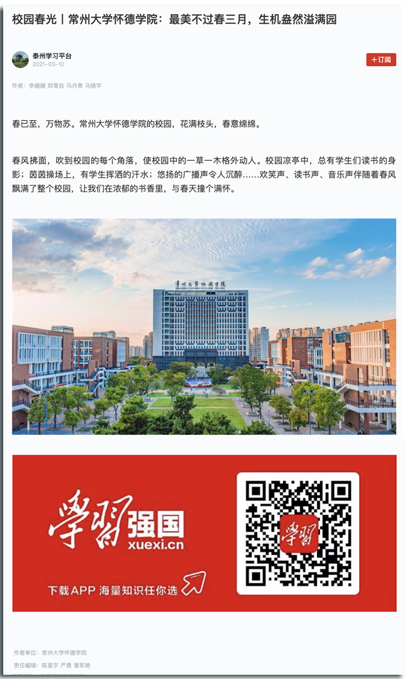 春已至,万物苏。常州大学怀德学院的校园,花满枝头,春意绵绵。