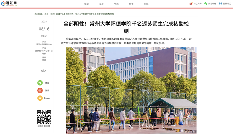 根据省教育厅、省卫生健康委、省财政厅2021年春季学期返苏高校大学生核酸检测工作要求,3月12日~15日,常州大学怀德学院对3336名返苏师生开展了核酸检测工作,所有师生检测结果为阴性,均无异常。