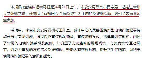 本报讯 (全媒体记者马钰超)4月21日上午,市公安局联合市民宗局一起走进常州大学怀德学院,开展以“石榴同心 全民反诈”为主题的反诈骗活动,吸引了数百名师生参加。