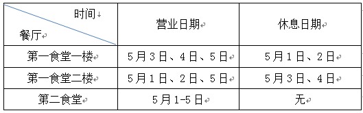 本次“五一”放假时间为2021年5月1日至2021年5月5日,共计五天。请各部门、各班级做好假期安排,离校时断水断电,关好门窗。现就教室、食堂、学生公寓等作如下安排: