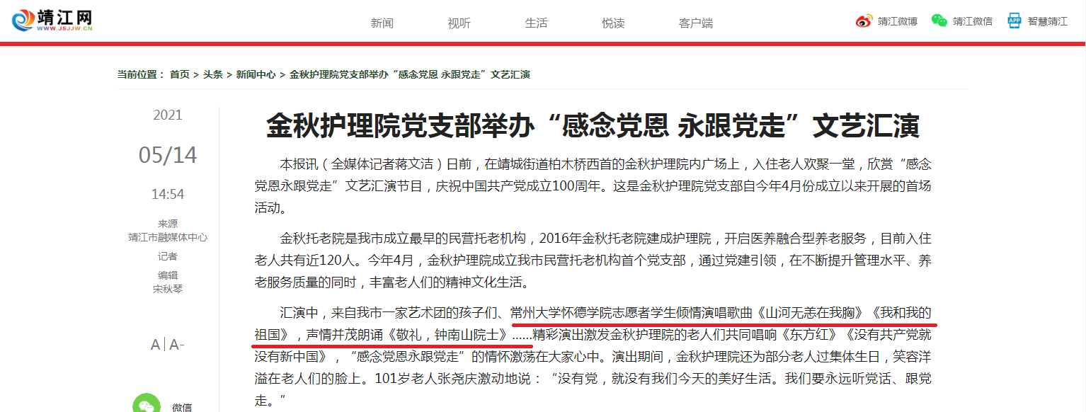 本报讯(全媒体记者蒋文洁)日前,在靖城街道柏木桥西首的金秋护理院内广场上,入住老人欢聚一堂,欣赏“感念党恩永跟党走”文艺汇演节目,庆祝中国共产党成立100周年。这是金秋护理院党支部自今年4月份成立以来开展的首场活动。