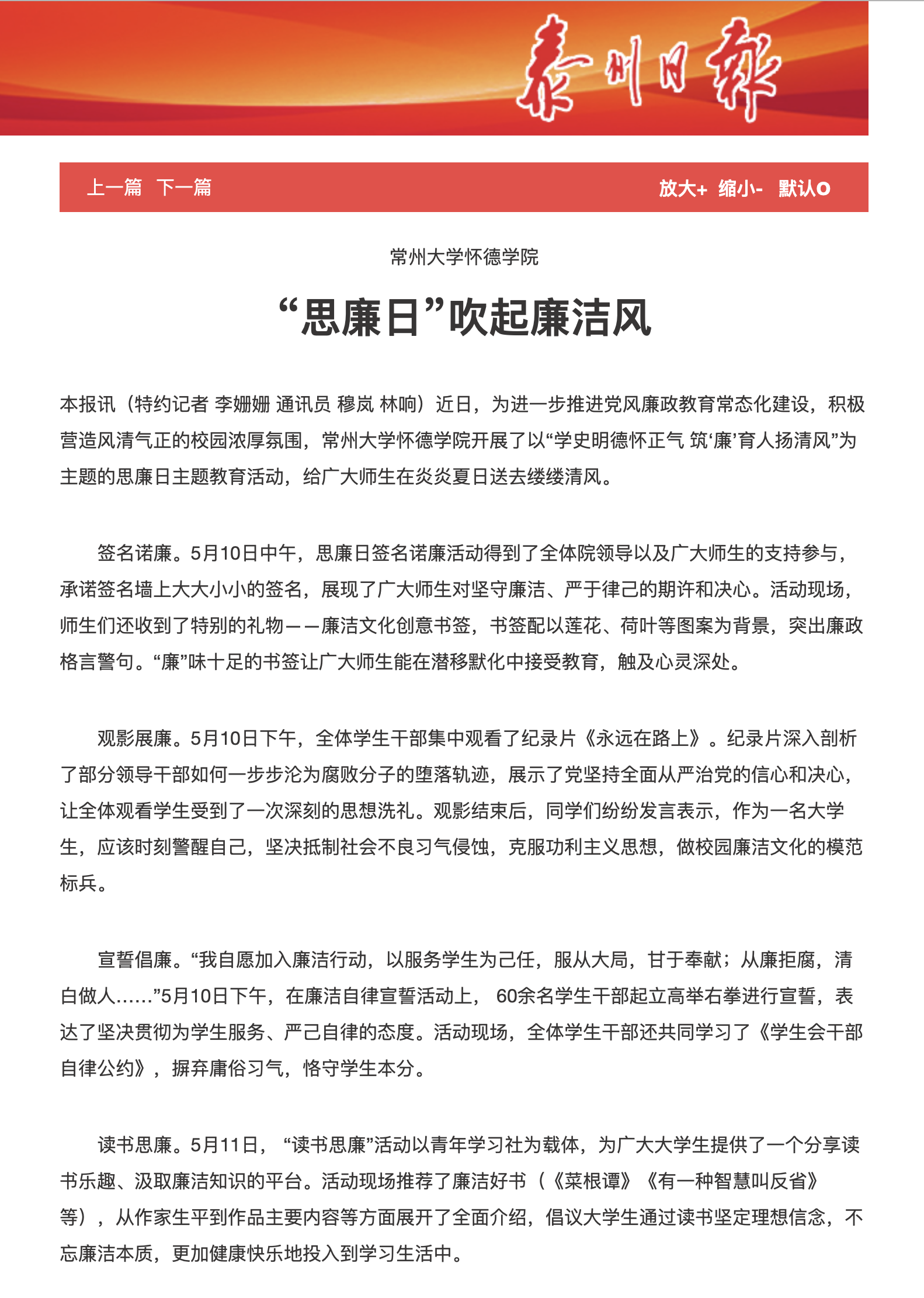 本报讯(特约记者 李姗姗 通讯员 穆岚 林响)近日,为进一步推进党风廉政教育常态化建设,积极营造风清气正的校园浓厚氛围,常州大学怀德学院开展了以“学史明德怀正气 筑‘廉’育人扬清风”为主题的思廉日主题教育活动,给广大师生在炎炎夏日送去缕缕清风。