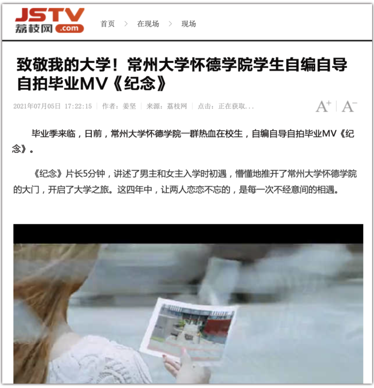 毕业季来临,日前,常州大学怀德学院一群热血在校大学生,自编自导自拍毕业MV《纪念》。