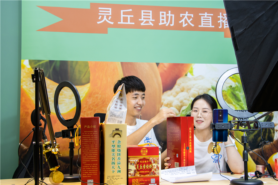 支教期间,团队成员发现灵丘有不少优质特色农副产品,便主动与当地电商产业园取得联系。7月29日,支教团成员白晗、王妍走进灵丘县助农直播间,通过现场直播,为灵丘特色农产品“代言”。3个小时的直播里,大学生不遗余力地向网友推介黄烧饼、灵丘小金米、苦荞晶茶、枣糕饼等特产。
