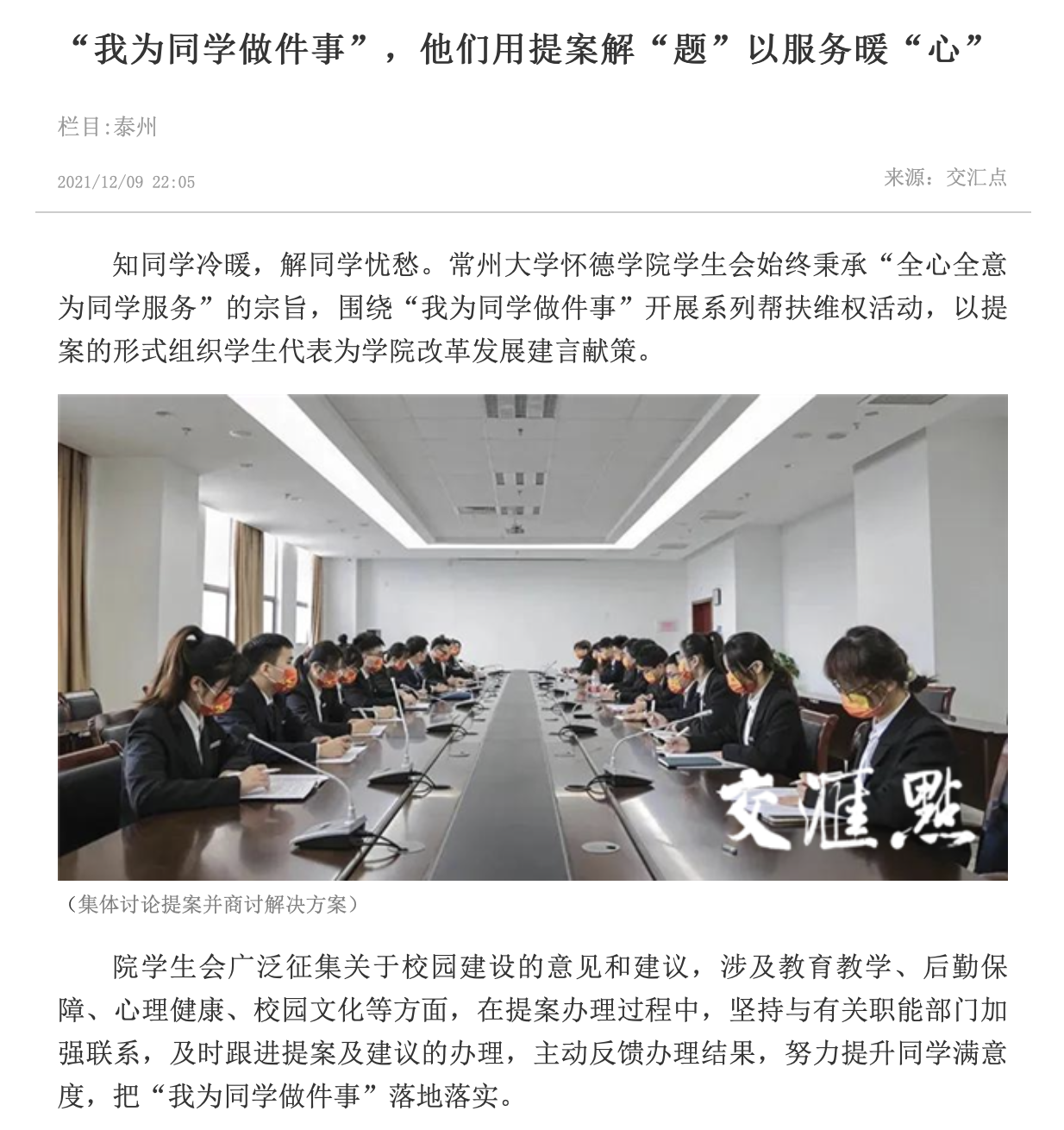 知同学冷暖,解同学忧愁。常州大学怀德学院学生会始终秉承“全心全意为同学服务”的宗旨,围绕“我为同学做件事”开展系列帮扶维权活动,以提案的形式组织学生代表为学院改革发展建言献策。