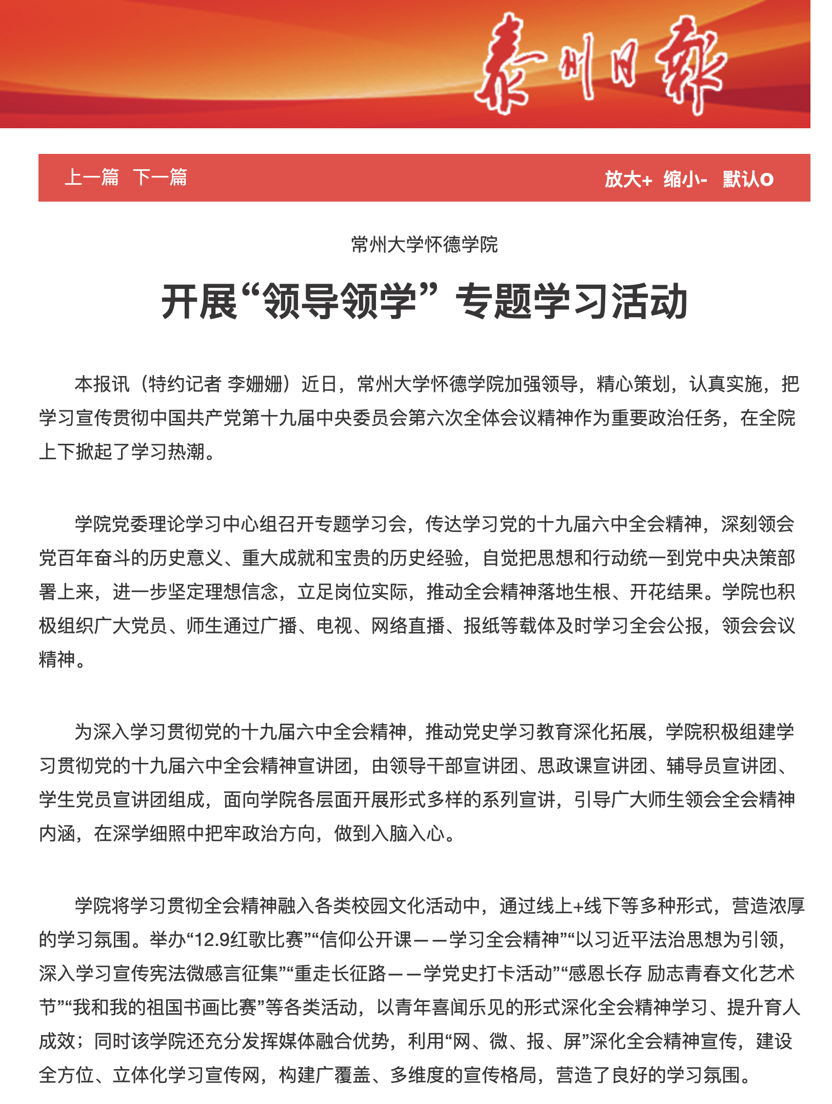 泰州日报:常州大学怀德学院开展“领导领学” 专题学习活动