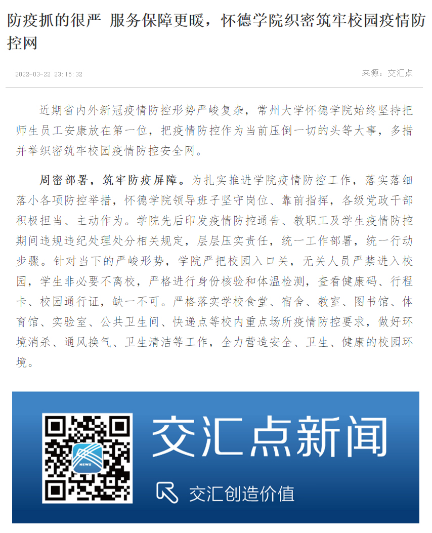 近期省内外新冠肺炎疫情防控形势严峻复杂,常州大学怀德学院始终坚持把师生员工安康放在第一位,把疫情防控作为当前压倒一切的头等大事,多措并举织密筑牢校园疫情防控安全网。