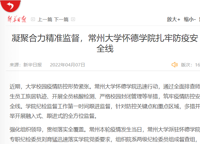 强化组织领导,贯彻落实全覆盖。常州本轮疫情发生当日,常州大学派驻怀德学院专职纪检委员刘育猛迅速落实学院党委要求,组织院系两级纪检委员组成督查组,全面开展疫情监督工作。督查组对应急处置、核酸检测、校园封闭管理、应急物资储备、后勤保障、学生教育管理等工作提出明确要求,强化底线思维,紧盯重点,压实责任,确保各项防控安排落地落实。督查组先后向学院党委提交多份督查通报,并有针对性地向相关负责人推送,督促及时查找不足、解决问题。