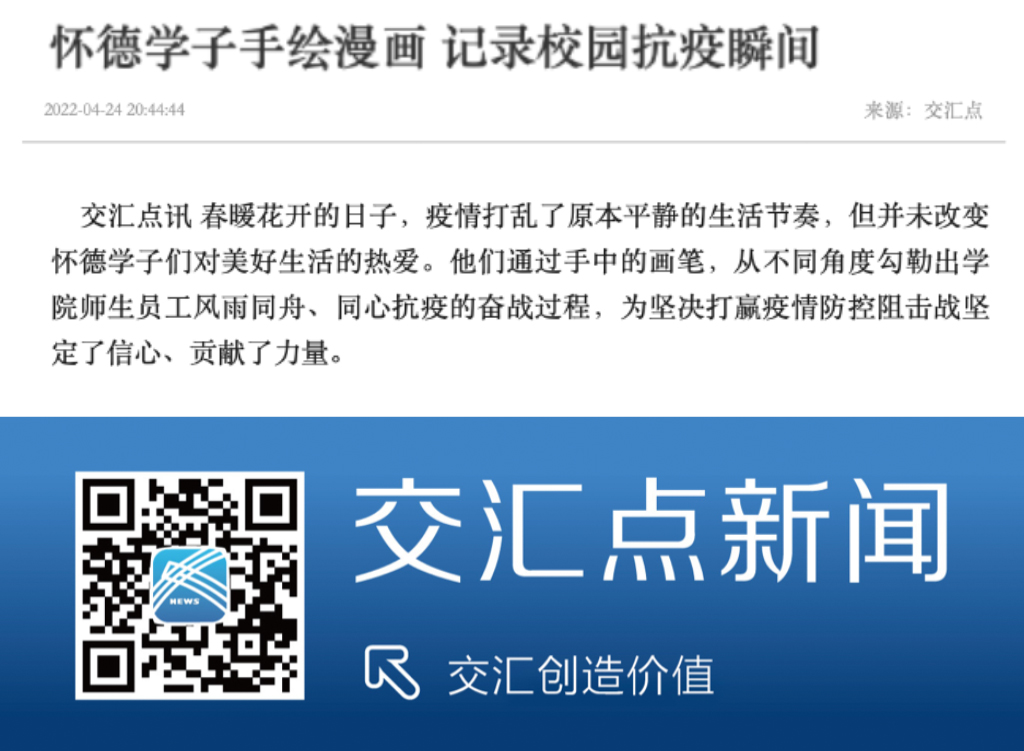 生活即课堂,疫情即教材。怀德学子以疫情防控中涌现出的鲜活人物和典型事迹为教材进行创作,让更多学子体验感受到身边的抗疫力量和人间大爱,进一步激励他们心怀家国、勇于担当、砥砺前行。
