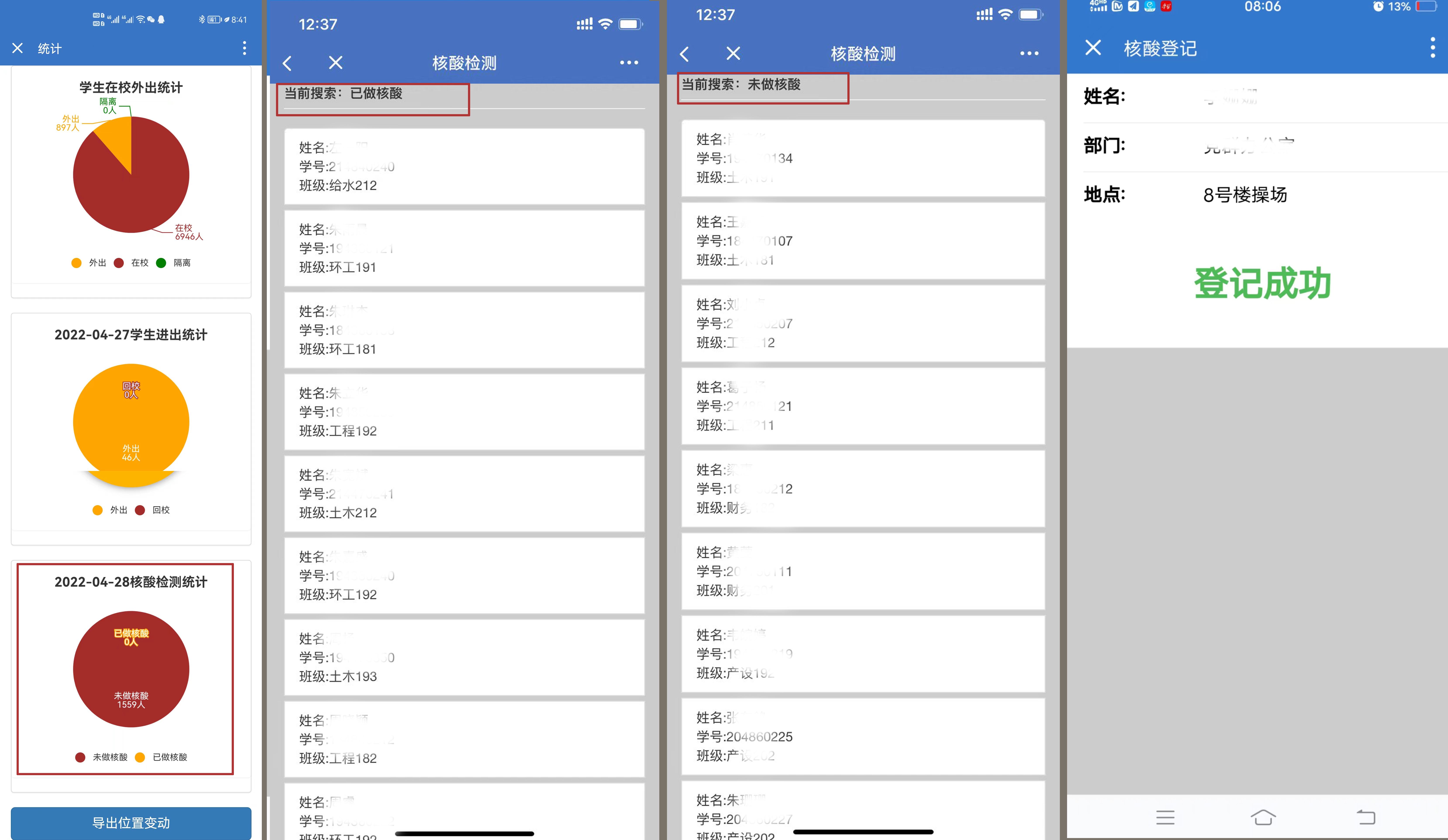 动态监测确保核酸检测“不掉队”。该校上线“核酸信息登记平台”,实现对校内全部检测人员的核酸信息统计看板,管理人员通过平台可迅速查看全校核酸检测详细信息,一目了然。该功能让核酸登记统计脱离人工操作,为管理人员合理分析师生员工核酸检测工作提供了数据支撑。“以往督促统计学生核酸检测数据每天要花4、5个小时,还容易出错,现在只要点开微信,随时可查看未检测学生的名单,点对点提醒,轻轻松松不漏一人。”辅导员任潇茜老师说。