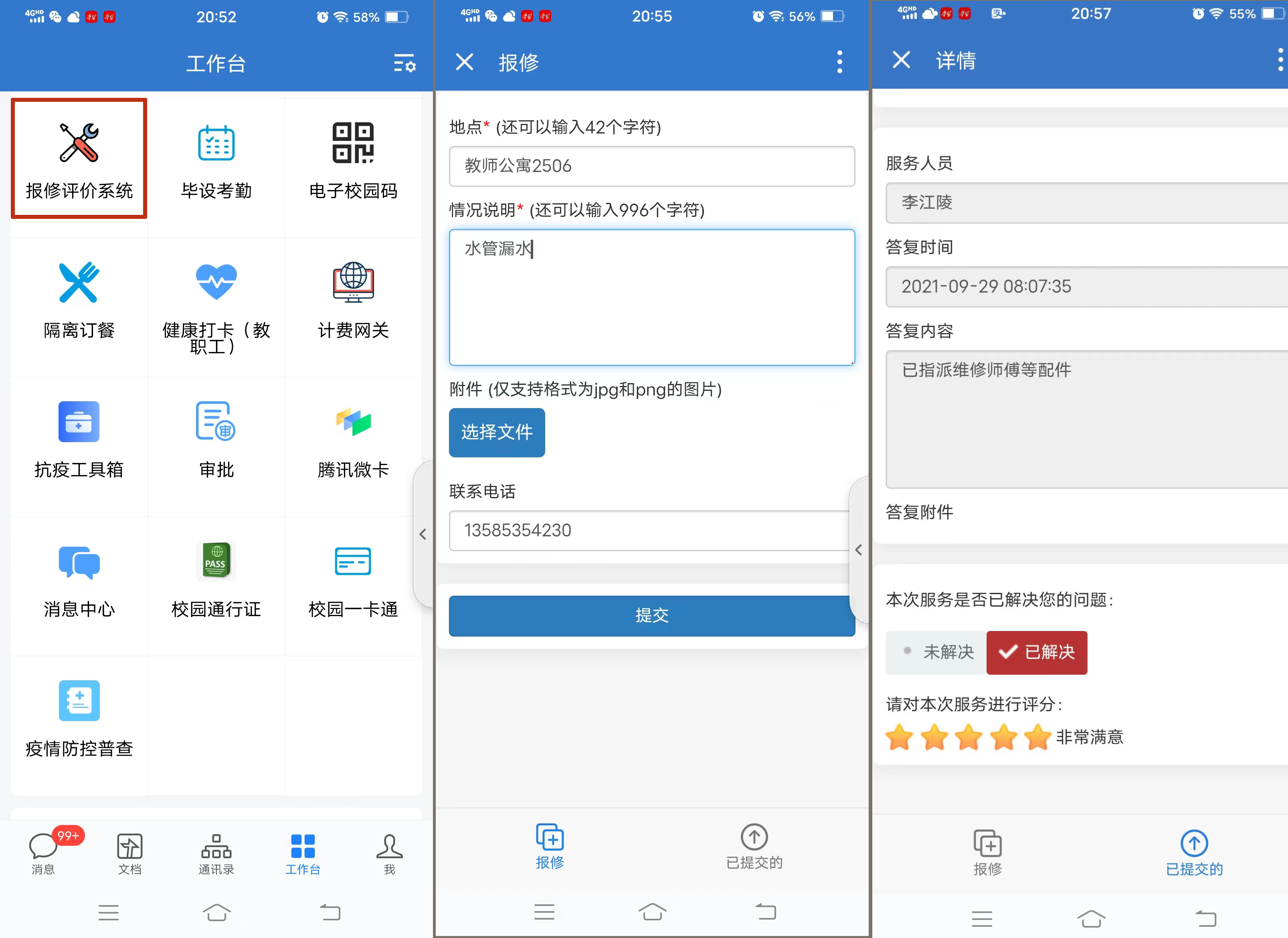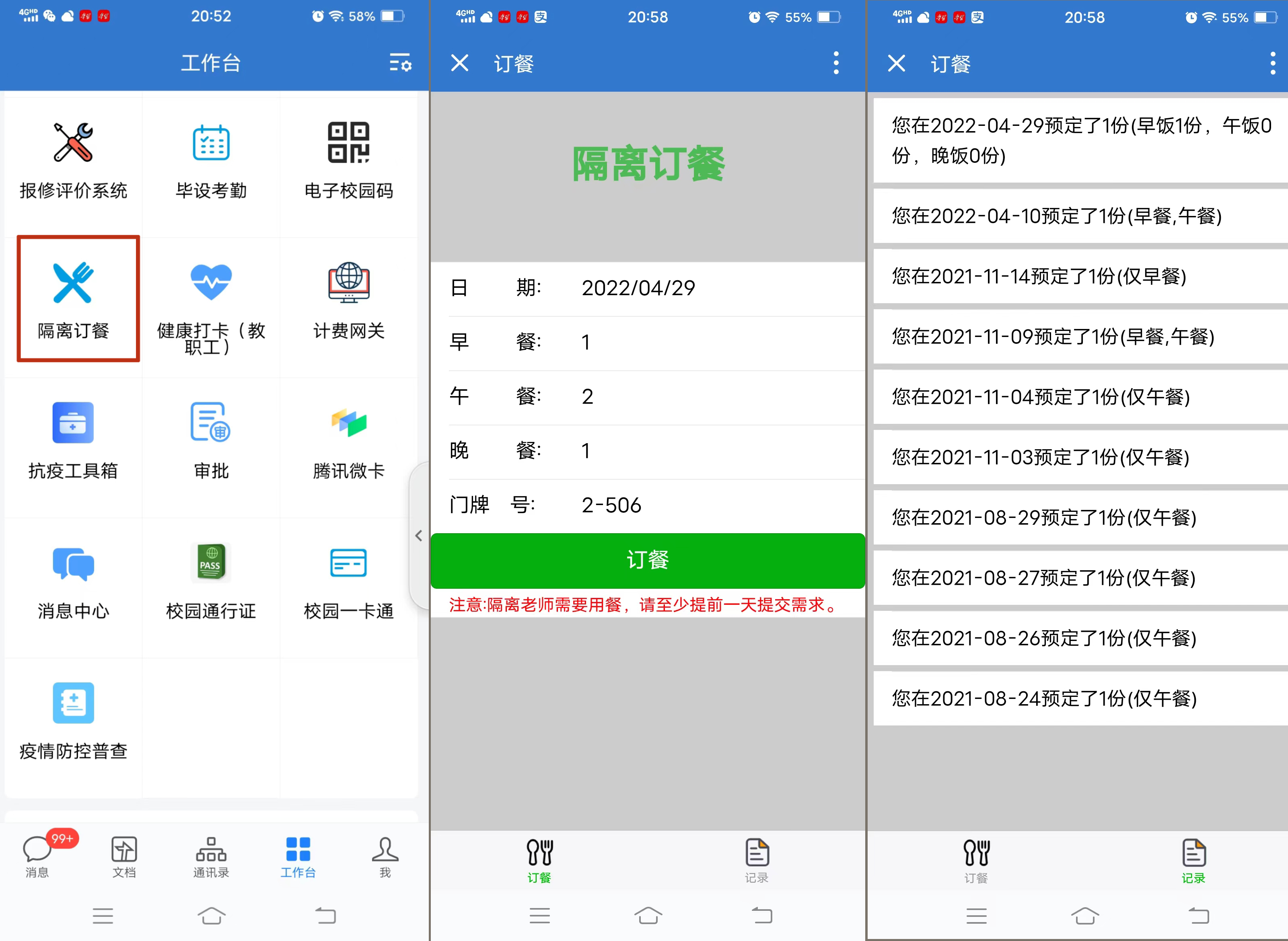 智慧校园应用场景“全覆盖”。结合本轮疫情防控中的管理需要,该校及时对企业微信中已上线的“防疫工具箱”“疫情防控普查”“毕设考勤”“校园一卡通”“班车查询”专属服务进行升级完善,响应线上“无接触”办事服务模式,深入推进学校日常管理数据化、信息化,稳步推进校园信息化建设。该校在企业微信专门上线“隔离订餐”系统,食堂工作人员30秒即可导出点餐汇总表,并安排配送,既节省了人力,也保证了服务效果不打折。此外,学院还在企业微信上线“报修评价”系统,实现线上“报、修、督、评”一体化全流程闭环与动态跟踪,实现了时效快、耗时少,操作也更加人性化。