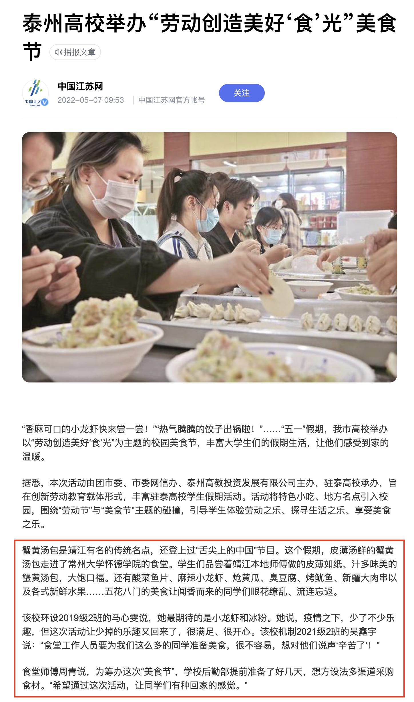 “香麻可口的小龙虾快来尝一尝!”“热气腾腾的饺子出锅啦!”……“五一”假期,我市高校举办以“劳动创造美好‘食’光”为主题的校园美食节,丰富大学生们的假期生活,让他们感受到家的温暖。