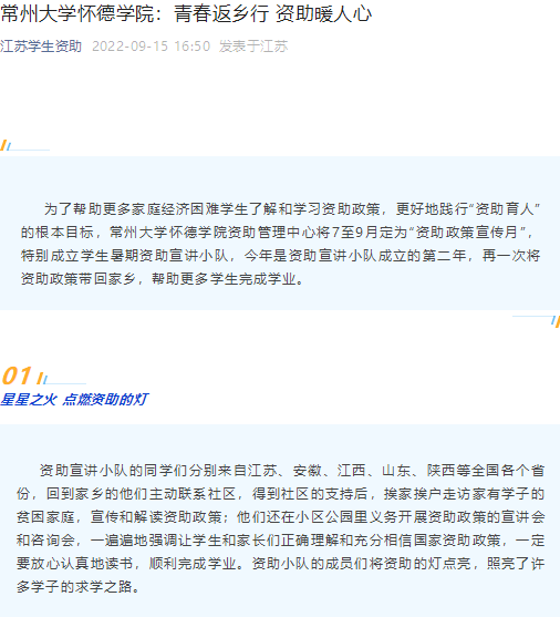 为了帮助更多家庭经济困难学生了解和学习资助政策,更好地践行“资助育人”的根本目标,常州大学怀德学院资助管理中心将7至9月定为“资助政策宣传月”,特别成立学生暑期资助宣讲小队,今年是资助宣讲小队成立的第二年,再一次将资助政策带回家乡,帮助更多学生完成学业。