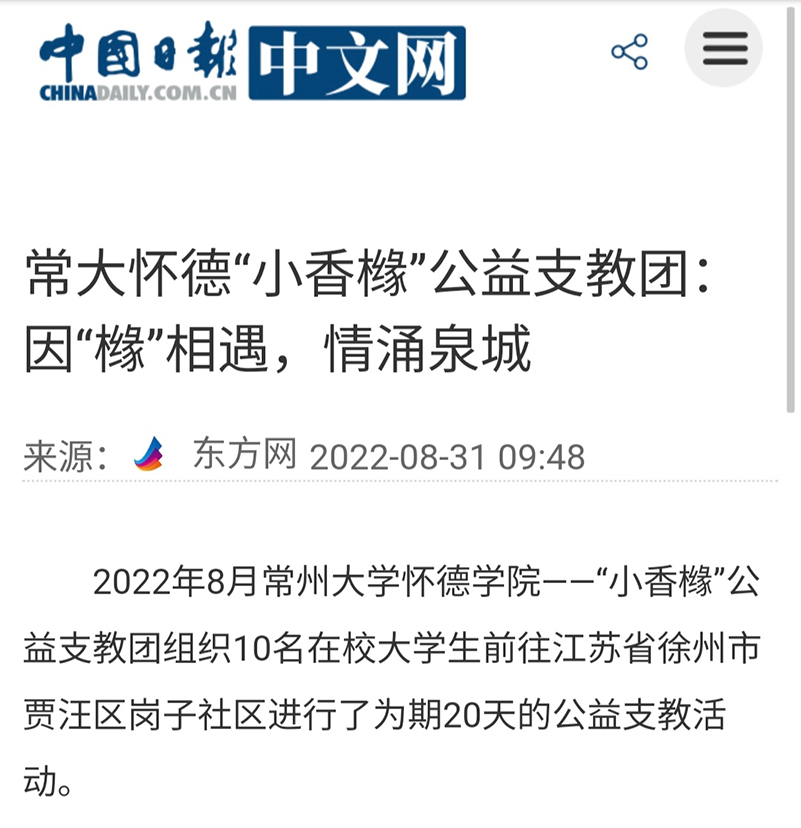 2022年8月常州大学怀德学院——“小香橼”公益支教团组织10名在校大学生前往江苏省徐州市贾汪区岗子社区进行了为期20天的公益支教活动。