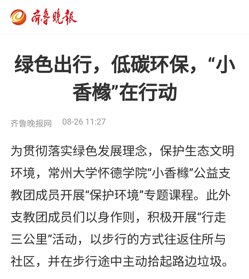 为贯彻落实绿色发展理念,保护生态文明环境,常州大学怀德学院“小香橼”公益支教团成员开展“保护环境”专题课程。此外支教团成员们以身作则,积极开展“行走三公里”活动,以步行的方式往返住所与社区,并在步行途中主动拾起路边垃圾。