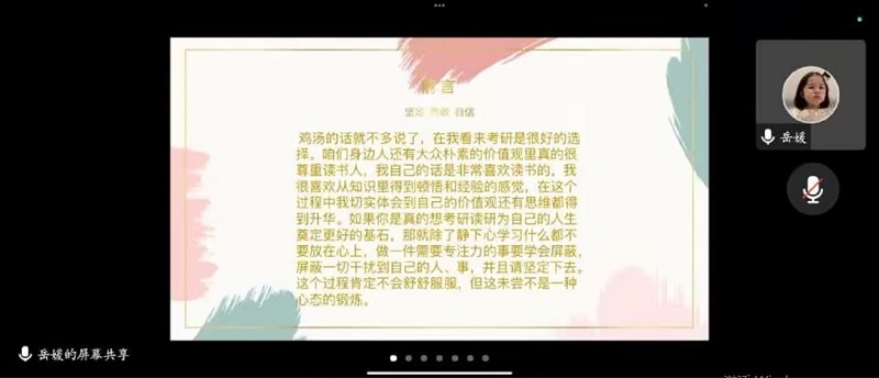 活动中,学长学姐们们结合自己的经历,分享了自己在考研和出国留学方面的经验和感悟。包括如何准备申请材料、如何制定计划和时间表、如何应对考试等等,让参加活动的学生们从他们的经验中学习,避免走弯路。