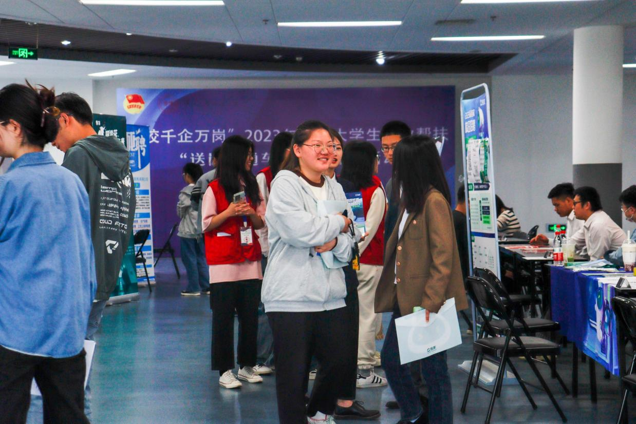 招聘会开始前,任潇茜在现场指引各用人单位入座,志愿者们引导前来面试的同学有序排队。招聘会开始后,会场秩序井然、气氛热烈。各单位热情地向同学们介绍企业情况、岗位需求、薪资待遇和发展空间等内容,同学们也积极地和各单位交流,展现自己的能力,向心仪单位投递了精心准备的简历。