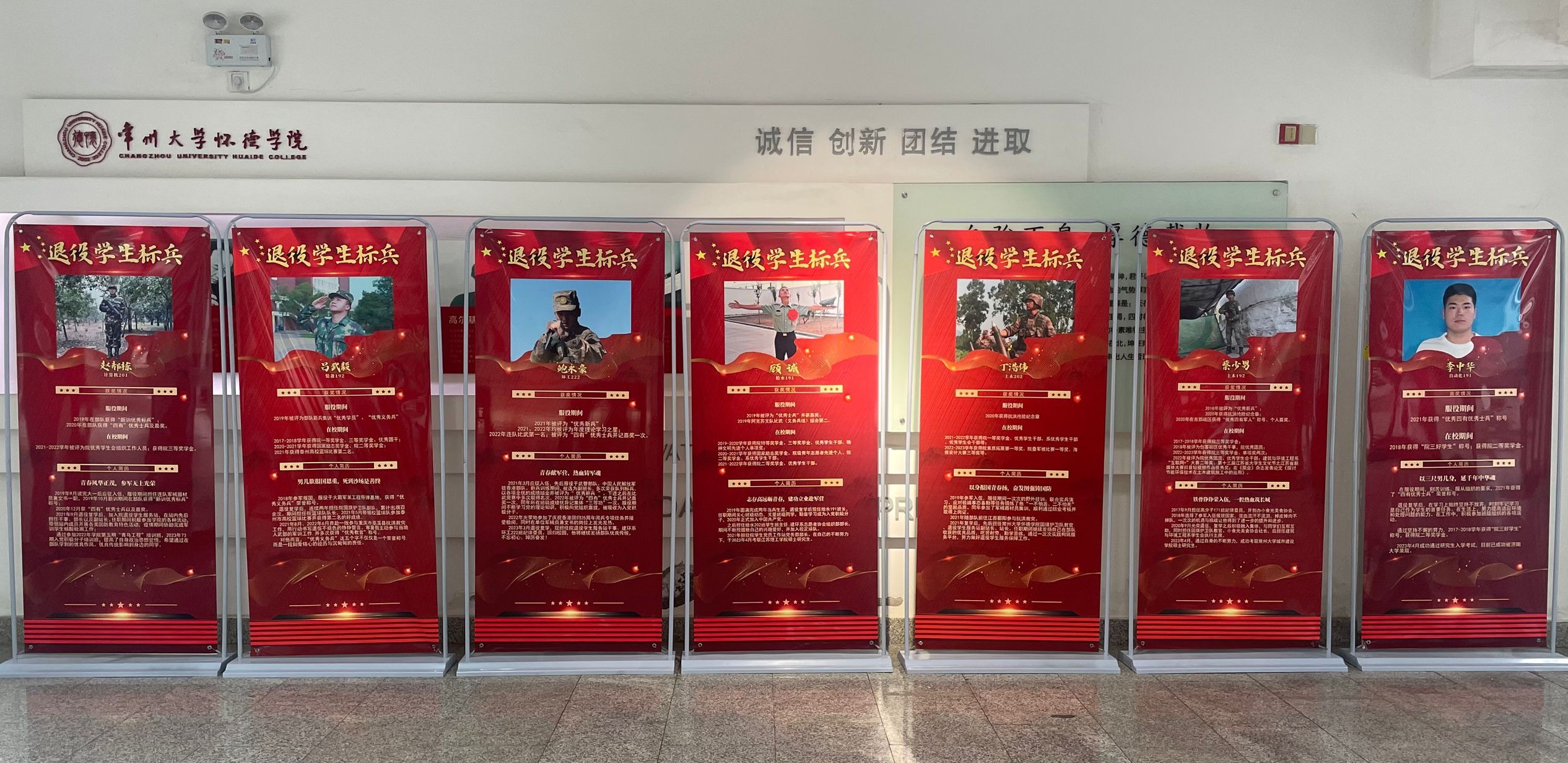 大学生踊跃应征入伍近年来已成为一种新常态,圆梦军营也成为越来越多有志青年的目标追求。本次退役学生标兵人物展通过报名推荐、各部门审核,选取了七位优秀的退役学生代表。展示内容包括学生个人风采、部队经历、在校学习情况等,充分彰显了退役学生们听党话、跟党走的精神力量,退伍不褪色、退役不褪志的坚定决心。