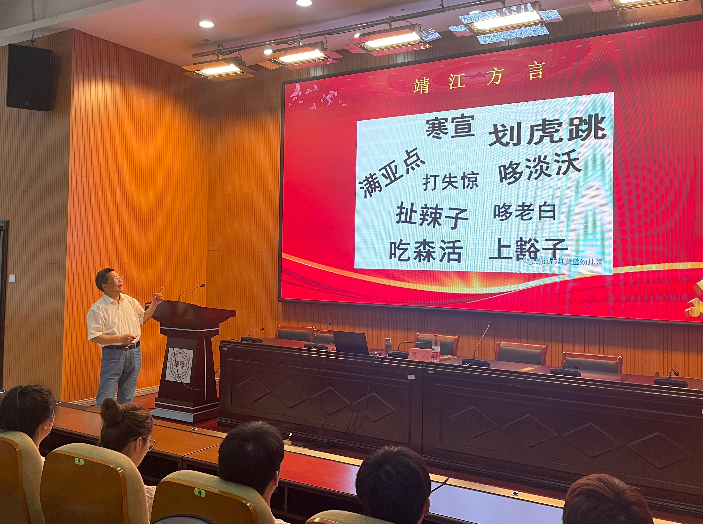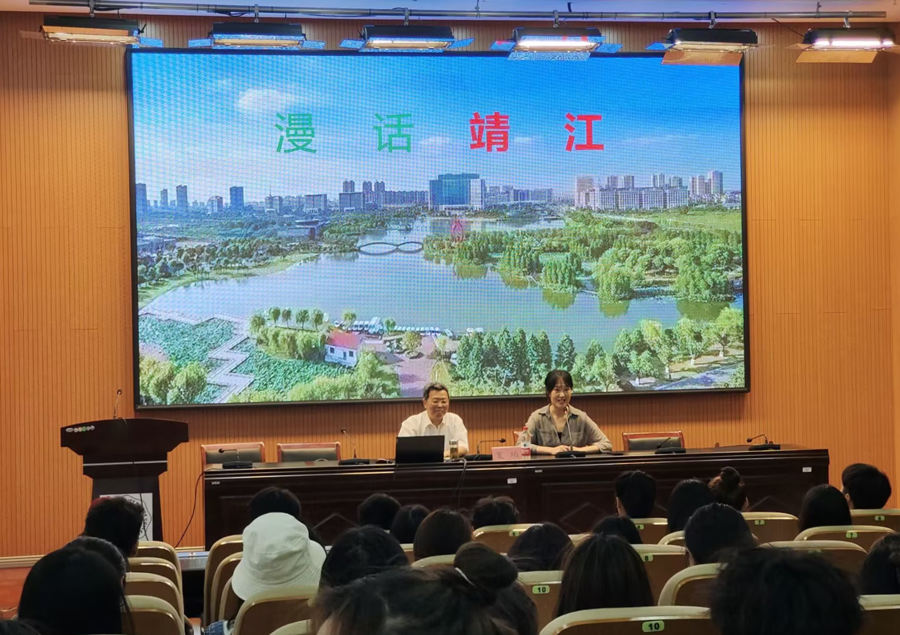 靖江三面环江,是一座新兴的港口工业城市。夏珀通过精美的图片、生动的语言为同学们介绍了靖江的历史沿革、地理环境、自然资源和风景名胜等,展示了靖江的地域特色,领略了靖江的旖旎人文。从昔日的马驮沙到今天的鱼米之乡,从苏北小县城到国家一类开放口岸,同学们深刻感受到了这座小城的独特魅力。