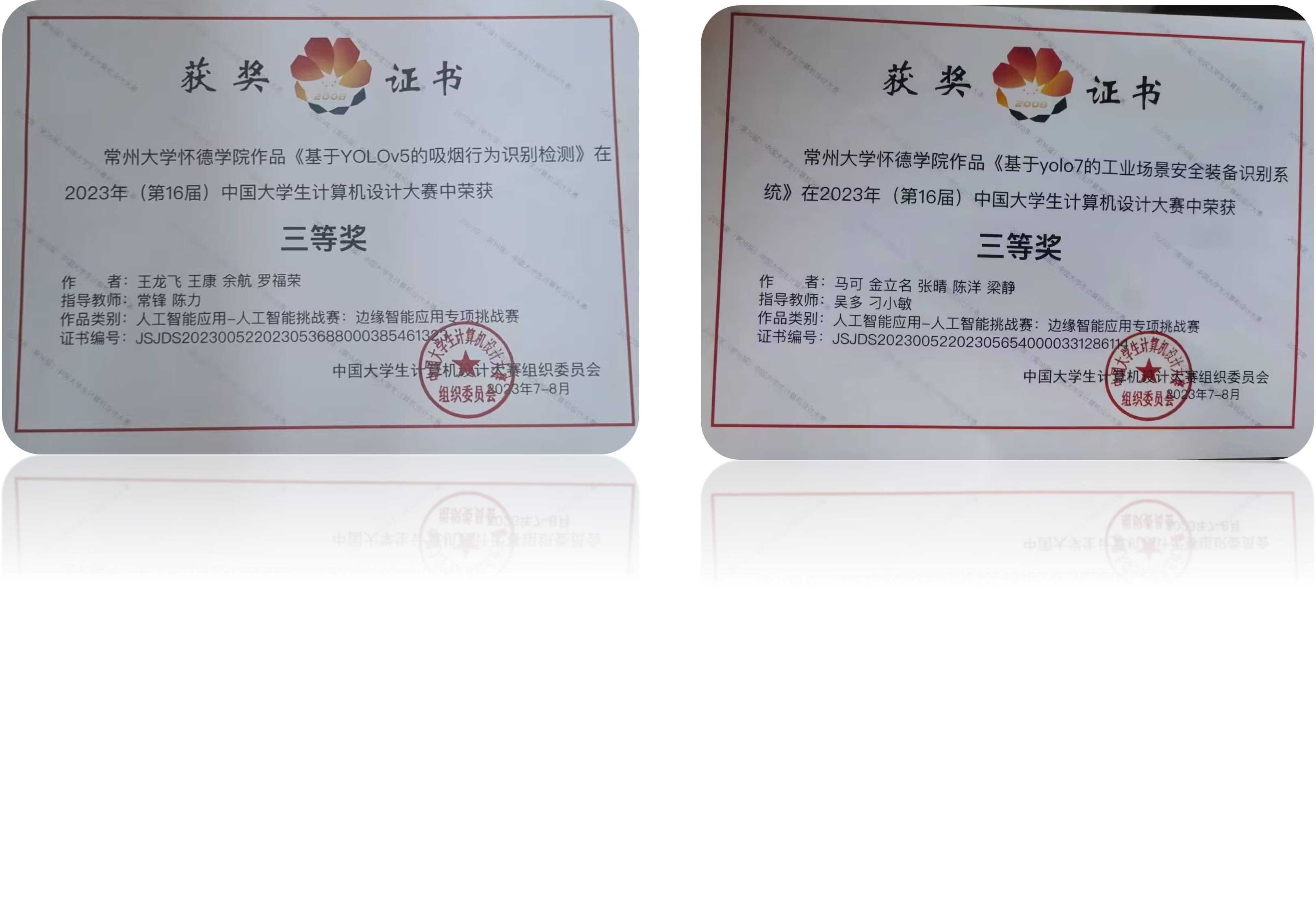 8月8日—8月11日,我院参加由中国大学生计算机设计大赛组织委员会主办,扬州大学承办的2023年(第16届)中国大学生计算机设计大赛(南京决赛区人工智能应用)。其中王龙飞,王康,余航,罗福荣四位同学的作品《基于YOLOv5的吸烟行为识别检测》(常峰、陈力指导);马可,金立名,张晴,陈洋,梁静五位同学设计的作品《基于yolo7的工业场景安全装备识别系统》(吴多、刁小敏指导)均获得人工智能挑战赛三等奖。