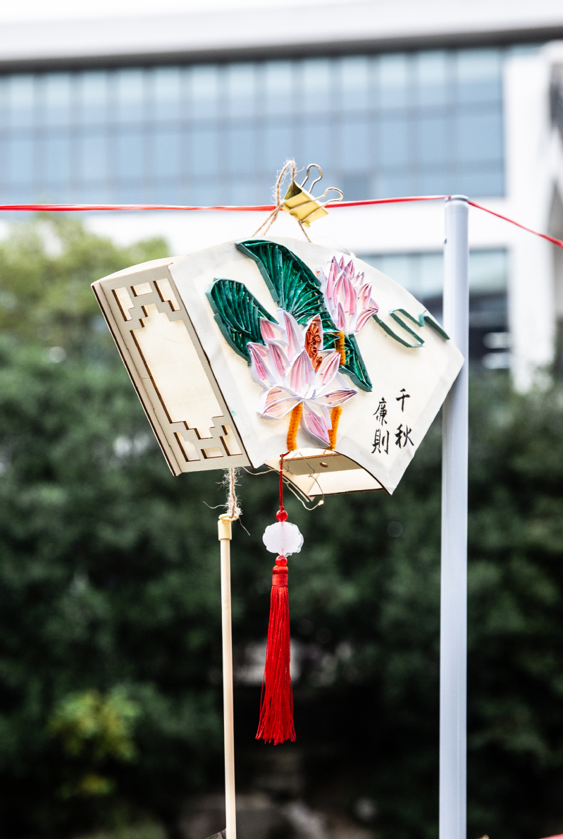 9月27日,43个花灯作品在第一食堂广场周围展出,现场对其进行了评选。过往的师生纷纷驻足观看,为喜爱的花灯作品贴上了小红花,气氛热烈。展出作品样式繁多、做工精细、造型美观,干花、塑料、绒布等材料都被巧妙运用到了花灯制作当中,参赛选手们将莲花、竹子等廉洁元素融入花灯制作过程,生动形象地将廉洁文化和传统文化相融合,有较强的吸引力和感染力,对现场参观的师生起到了教育警示作用。