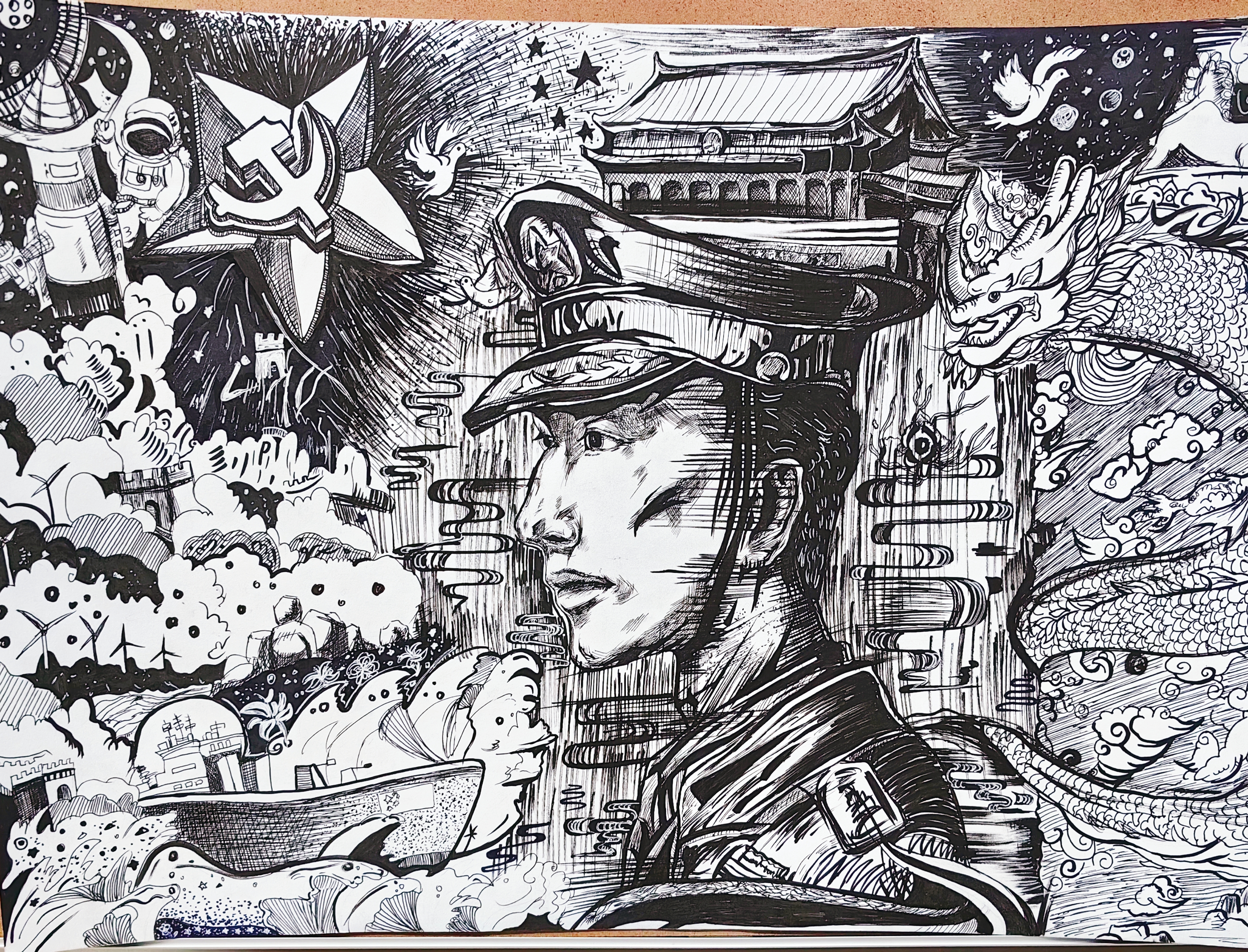 参赛学生从不同的视角将爱国情怀与个人艺术风格相结合,作品构思新颖,画面美观,书写工整。有的在画中渲染爱国情怀,有的在文中书写豪情万丈……一图一画,一字一句,不仅淋漓尽致地表达了同学们的满腔热情,更是对中国国防事业日益壮大的美好记录。最终,工作人员挑选出三十三份作品进行现场展示,选手们的参赛作品赢得观众的阵阵赞叹,在欣赏手贴报的同时也为同学们树立了远大的强军梦想。