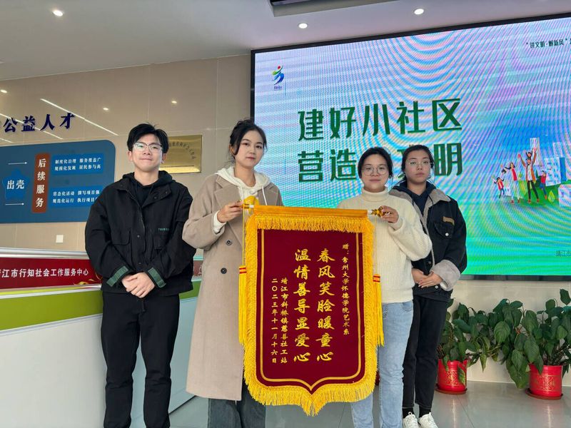 为感谢常州大学怀德学院艺术系青年志愿者对靖江市斜桥镇留守儿童的关心与呵护,11月28日上午,靖江市斜桥镇慈善社工站向艺术系赠送锦旗表示感谢。赠送仪式在靖江市斜桥镇新时代文明实践所举行,艺术系党总支副书记司马亚琴、系团总支书记帅博文、辅导员刘英啸出席仪式。