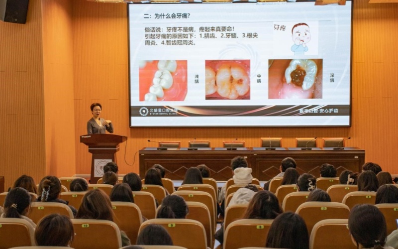 讲座中,沈羽婷针对日常生活中常见的口腔问题,如龋齿、牙龈炎、牙周病等,进行了详细的讲解。她指出,这些问题的发生往往与不良的生活习惯和饮食习惯有关。同时,沈羽婷还向同学们介绍了正确的刷牙方法、牙线的使用、漱口水的选择等口腔保健基本技能。她强调,正确的口腔保健方法不仅可以预防口腔疾病的发生,还可以提高生活质量。讲座结束之后,北极星口腔中心的医生们还前往二食堂门口为我院学生进行口腔义诊,针对同学们的不同症状展开讲解。