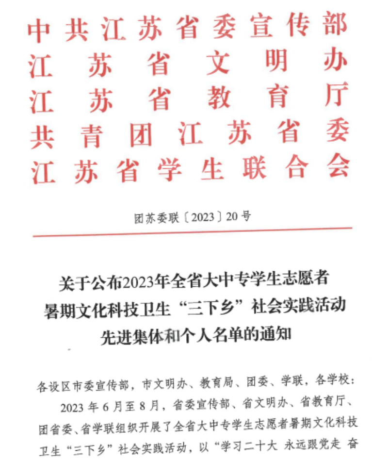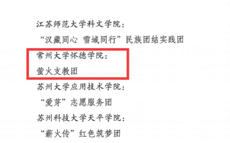 为深入总结交流经验、选树典型宣传、推动引领示范、激励广泛参与、发挥育人实效,经基层申报、省级团委审核,常州大学怀德学院萤火支教团被授予社会实践活动先进集体称号。