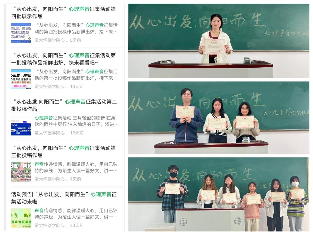 本次活动,同学们精心地录制了一段段音频,以自己独特的声线为媒介,或讲述自身刻骨铭心的成长经历,或为陌生人推荐一本好书、诵一篇美文、科普一个心理学小知识。工作人员定期挑选合格作品发布至公众号推文进行了展示,用有声文字赋予他人勇气与力量,鼓励大家以阳光心态拥抱生活。最终,心理健康中心老师评选出一等奖1名、二等奖3名、三等奖6名并颁发奖品。