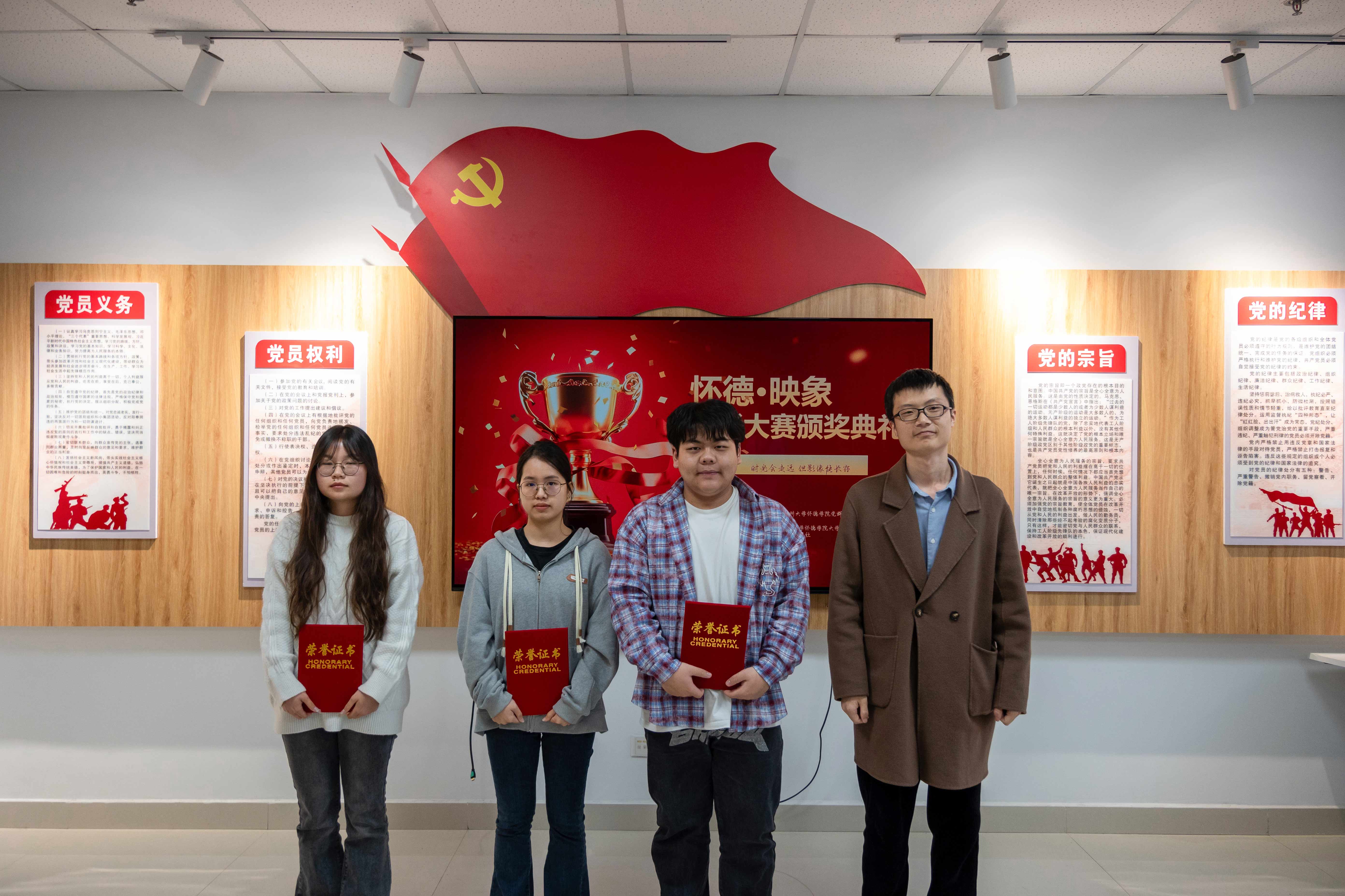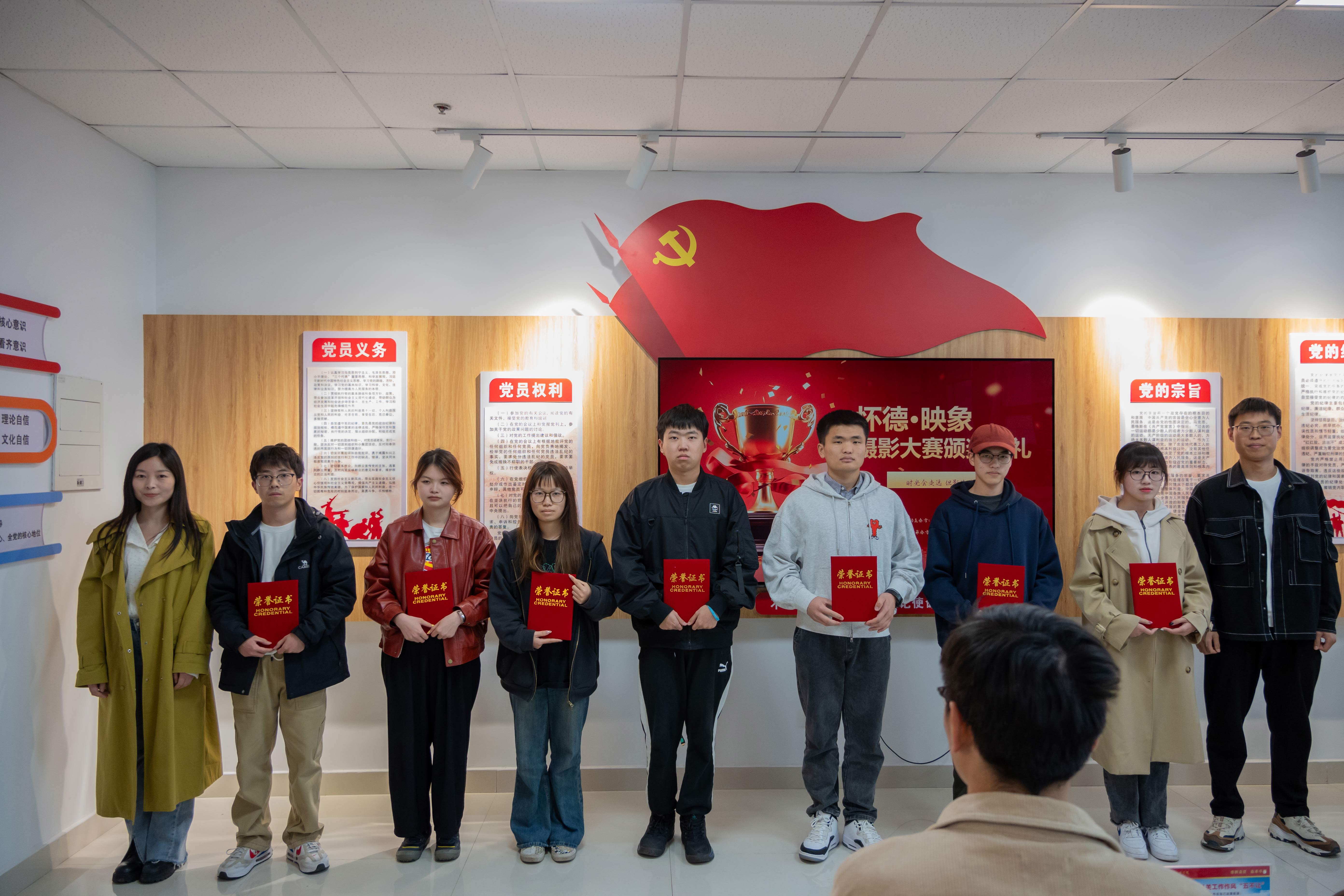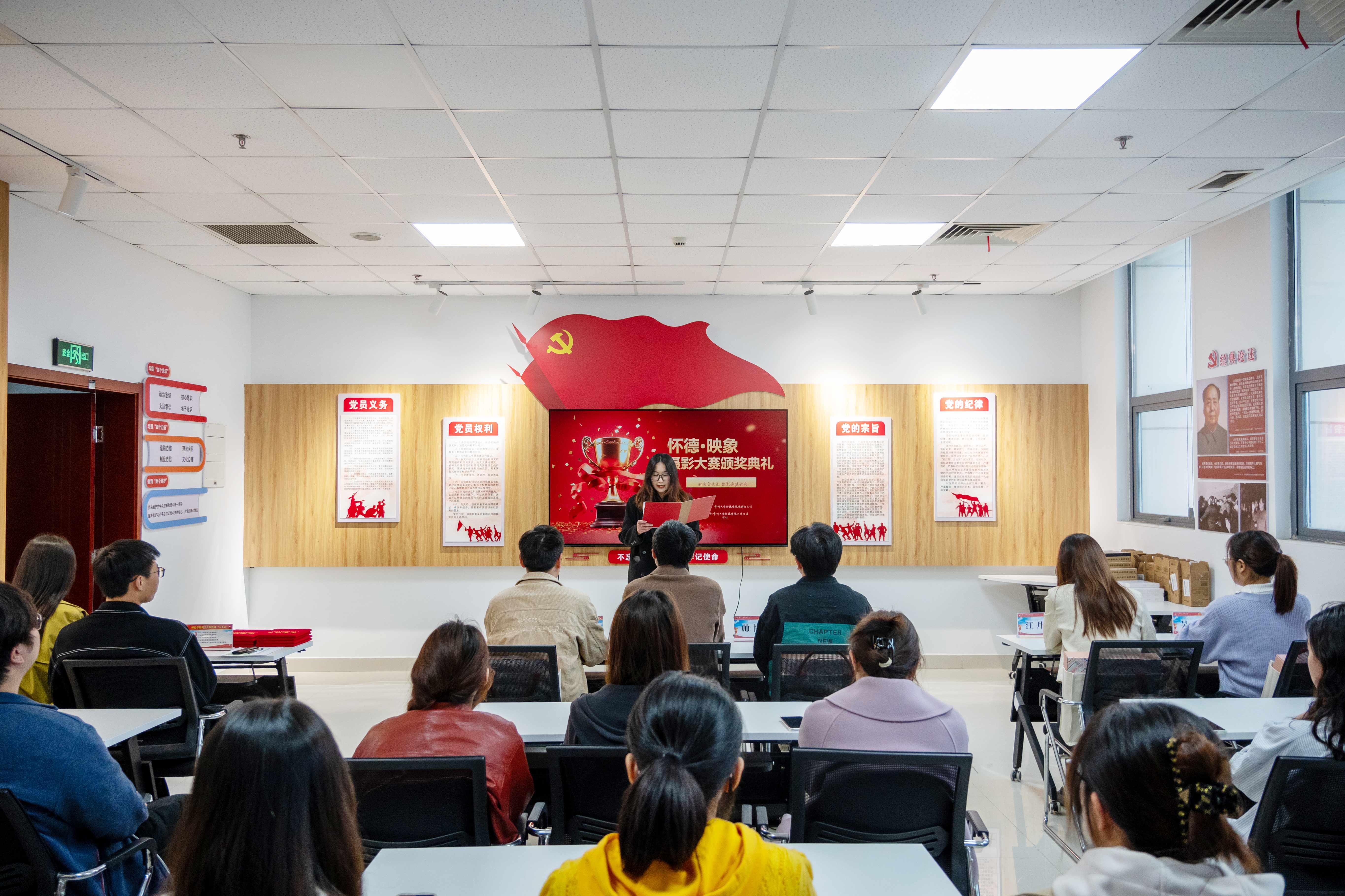 典礼在欢乐的氛围中拉开了序幕。主持人向现场同学们介绍了到场嘉宾老师并简要介绍了“怀德映像”摄影大赛的开展情况及评奖细则。本次活动自3月份开展以来受到全院学生的踊跃参与,共收到优秀投稿作品300余份,经过专业评审团审核打分,共评选出一等奖3名、二等奖8名,三等奖15名,优秀奖27名。主持人宣读本次颁奖典礼获奖名单,嘉宾老师为获奖同学颁发证书并合影留念。典礼最后,李姗姗老师对本次比赛作点评总结,她从构图、拍摄手法等角度对参赛作品进行了点评,她勉励同学们多用镜头记录点滴生活中闪光的瞬间,开阔自己的视野,提升摄影技能,并保持这份热爱奔赴无限未来。
