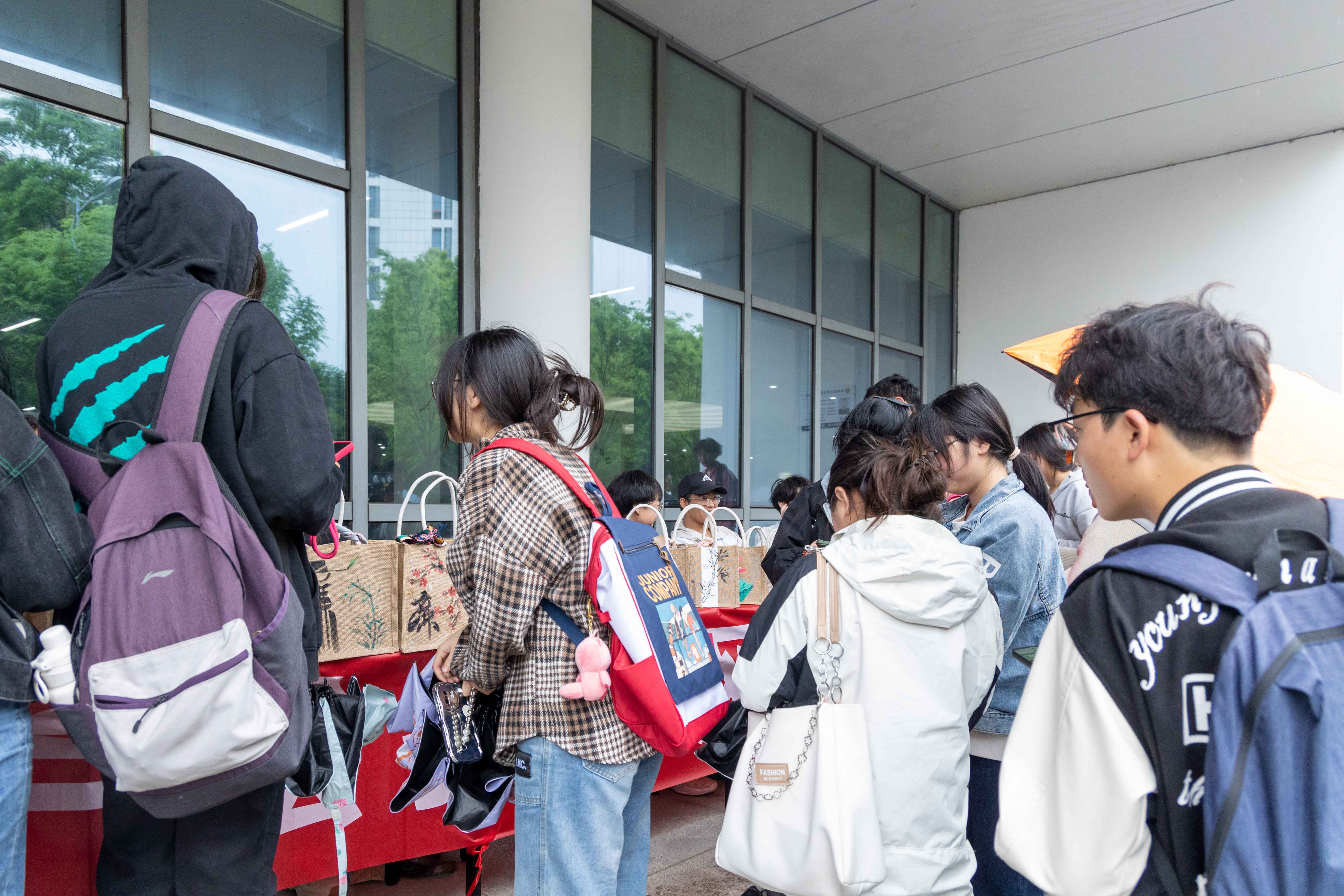 活动现场下着小雨,参与者仍然热情高涨,纷纷涌向兑换区,手持手机展示自己的集赞数量,工作人员仔细核对每个人的集赞数量,登记好领取者的基本信息,并根据规划发放相应类型的手提包,同时现场还针对廉洁相关话题进行交流,激发了师生、食堂阿姨的参与热情,在轻松愉快的氛围中学习廉洁知识。