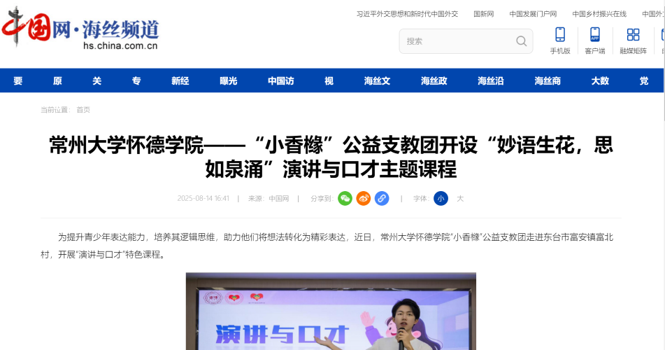 为提升青少年表达能力,培养其逻辑思维,助力他们将想法转化为精彩表达,近日,常州大学怀德学院“小香橼”公益支教团走进东台市富安镇富北村,开展“演讲与口才”特色课程。