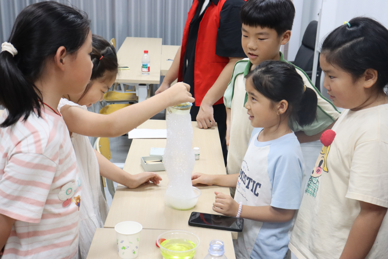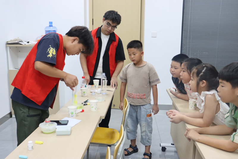 “大家注意观察,两种液体混在一起,溶液会发生什么变化呢?”志愿者手持试管,与孩子们一起探讨颜色变变变的奥秘。从《戳不破的纸巾》到《站立的牙签》,从《神奇的泡泡龙》到《荧光流星雨》……在“奇妙的化学实验”环节,志愿者们通过生活化材料,将抽象的科学原理转化为直观体验,孩子们瞪大眼睛、跃跃欲试。