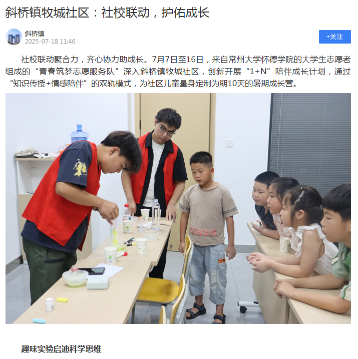 社校联动聚合力,齐心协力助成长。7月7日至16日,来自常州大学怀德学院的大学生志愿者组成的“青春筑梦志愿服务队”深入斜桥镇牧城社区,创新开展“1+N”陪伴成长计划,通过“知识传授+情感陪伴”的双轨模式,为社区儿童量身定制为期10天的暑期成长营。