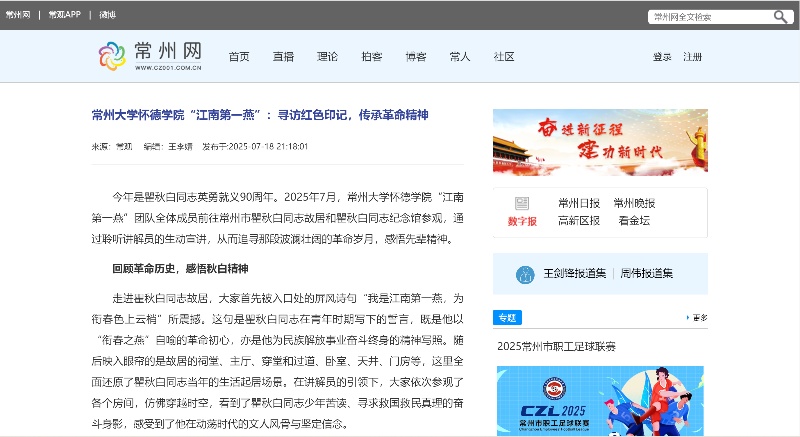 今年是瞿秋白同志英勇就义90周年。2025年7月,常州大学怀德学院“江南第一燕”团队全体成员前往常州市瞿秋白同志故居和瞿秋白同志纪念馆参观,通过聆听讲解员的生动宣讲,从而追寻那段波澜壮阔的革命岁月,感悟先辈精神。
