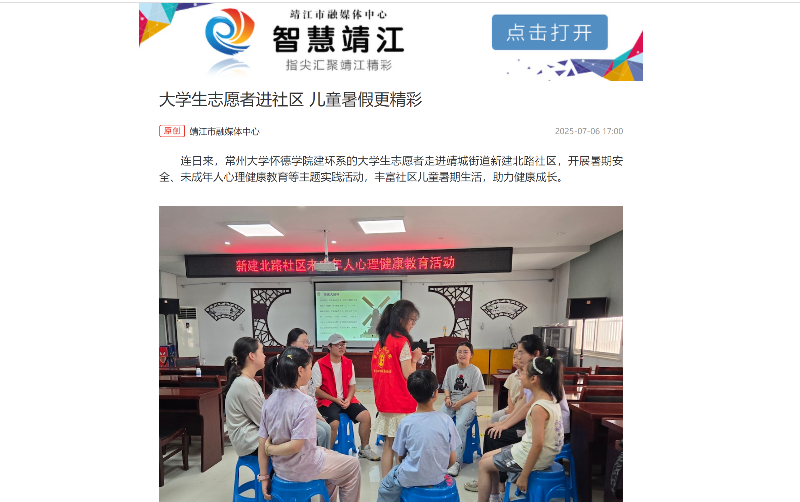 连日来,常州大学怀德学院建环系的大学生志愿者走进靖城街道新建北路社区,开展暑期安全、未成年人心理健康教育等主题实践活动,丰富社区儿童暑期生活,助力健康成长。