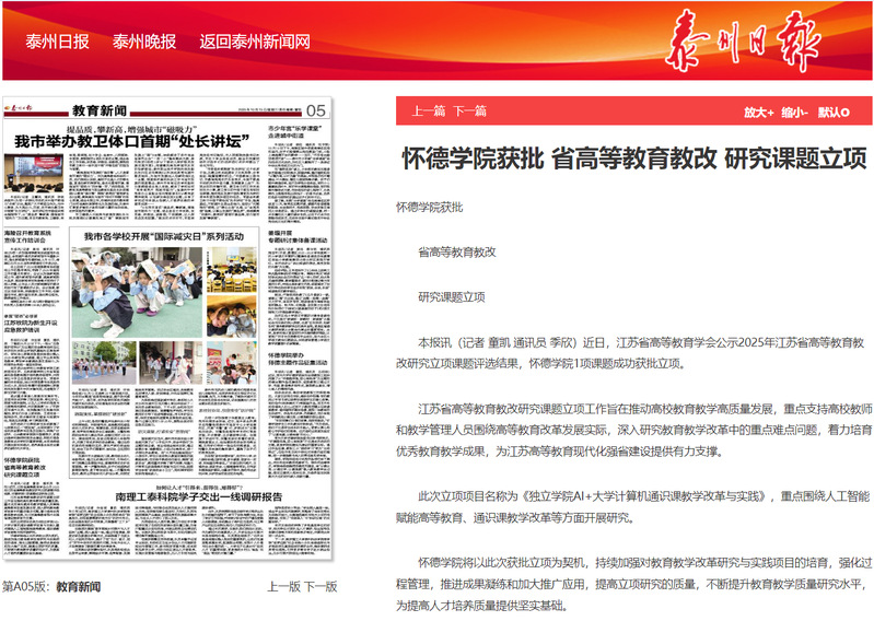 本报讯(记者 童凯 通讯员 季欣)近日,江苏省高等教育学会公示2025年江苏省高等教育教改研究立项课题评选结果,怀德学院1项课题成功获批立项。