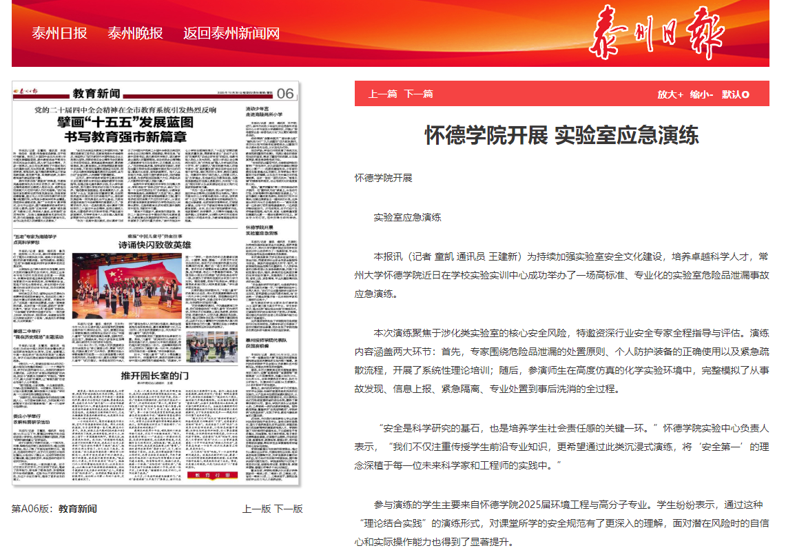 【泰州日报】怀德学院开展实验室应急演练