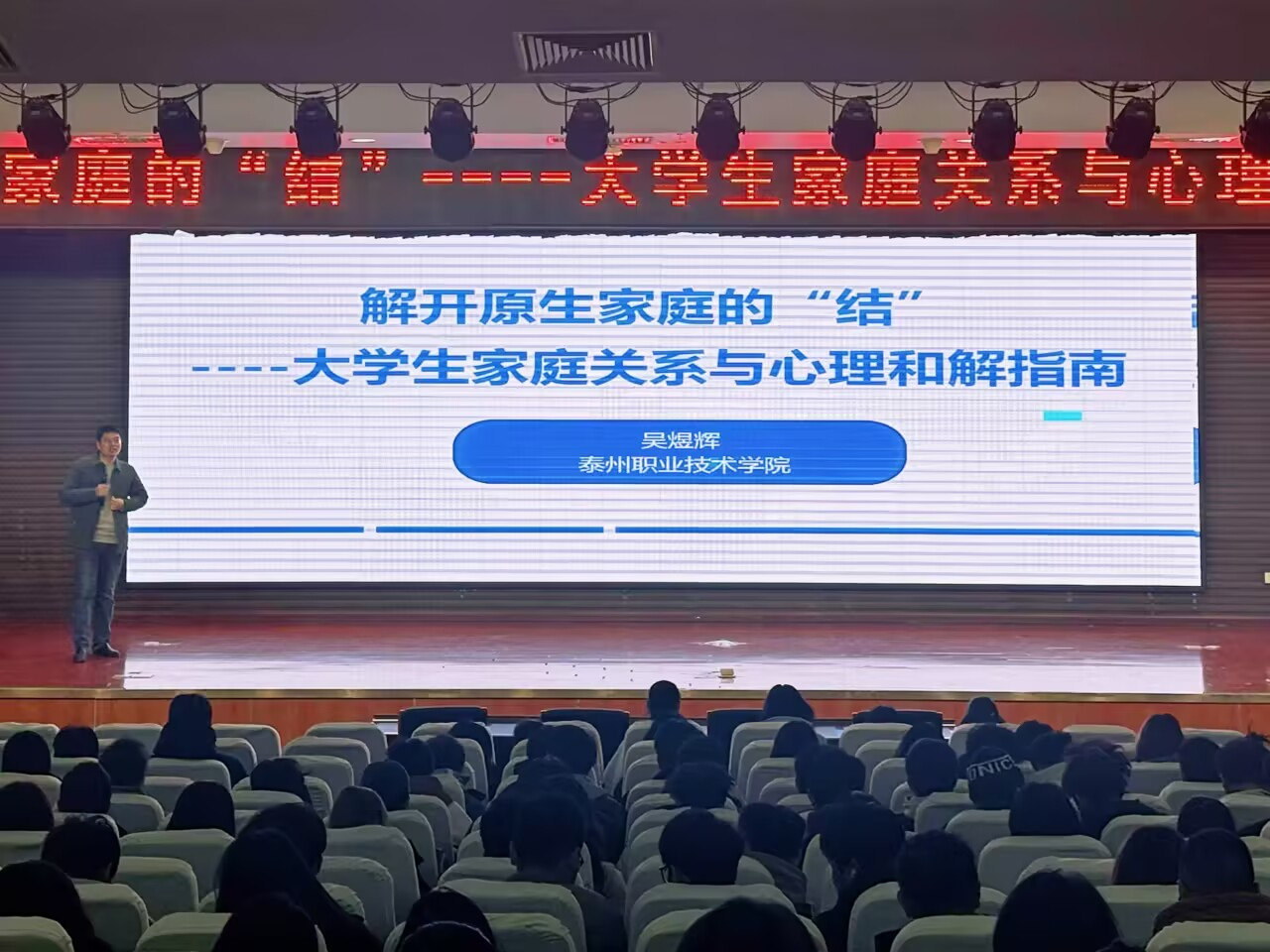 为帮助大学生梳理家庭关系、缓解心理困扰,11月20日下午,我院心理自助中心于怀德楼报告厅举办了“解开原生家庭的‘结’——大学生家庭关系与心理和解指南”讲座,本次讲座特邀国家二级心理咨询师、泰州职业技术学院心理健康教育中心主任吴煜辉副教授担任主讲人,全院500余名学生到场聆听。