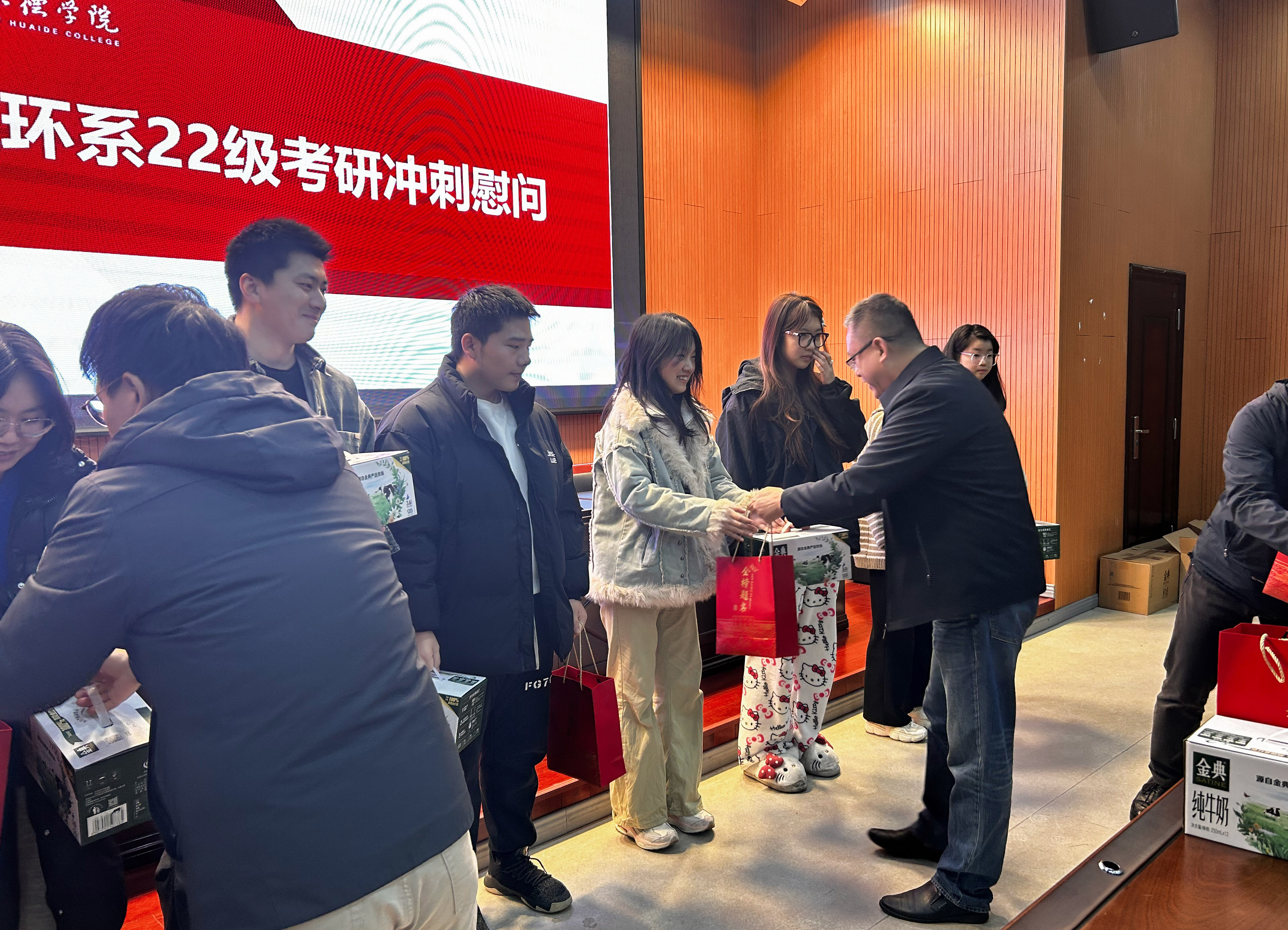 活动现场,何岩峰与同学们亲切交流,详细询问大家的复习进度、作息安排及备考中遇到的困难,同时结合全国考研总体形势、近几年考研报考人数趋势等数据为同学们答疑解惑,叮嘱同学们在最后冲刺阶段要科学规划时间、注重劳逸结合,保持平稳心态和健康体魄。活动最后,何岩峰与闫秋羽、张志军、唐杰共同为考研学子们送上“考研暖心包”,每一份物资都承载着系部对学子们的殷切期望,让备考学子在寒冬中感受到浓浓的关怀与温暖。系部表示将持续为同学们提供必要的支持与帮助,做大家最坚实的后盾。