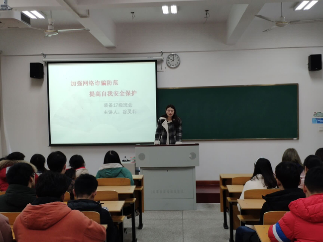 会上,谷灵莉老师就现在网络诈骗案高发的现象,给同学们一一列出发案率较高的网络诈骗类型,希望引起同学们的重视,提高警惕,杜绝同类案件发生,切实保护自身财产安全。