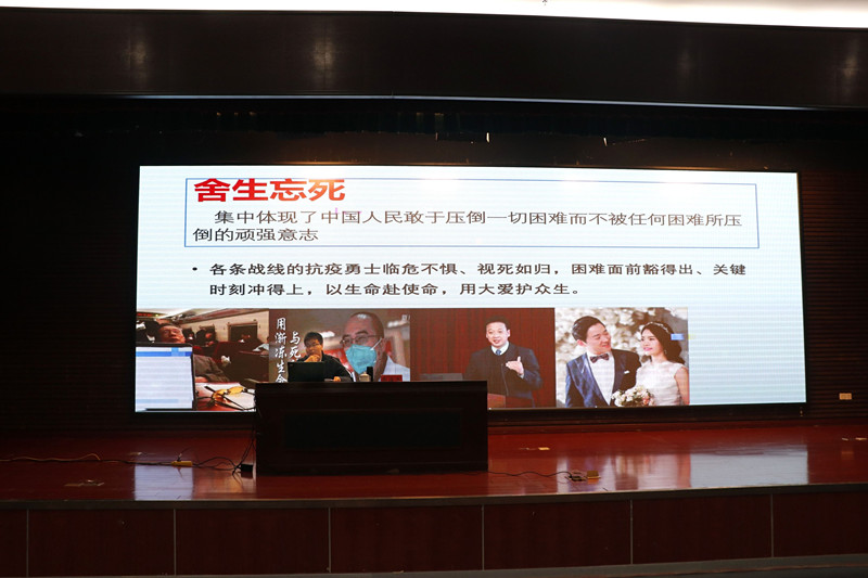 余海洋从党领导全国人民的抗疫历程、抗疫斗争实践证明的重要结论、伟大斗争铸就的伟大抗疫精神、弘扬抗疫精神成就时代新人等四个章节为各位同学展开讲述。同时,余海洋希望各位同学树立身为怀德人,与怀德命运与共的意识。