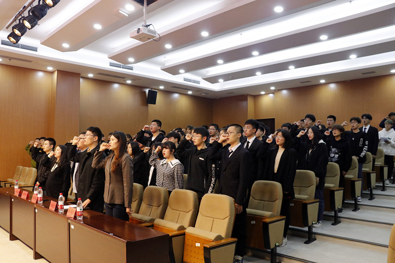 大会在雄壮的国歌声中拉开序幕,系学生会主席黄楠带领全体成员宣读誓词,各位老师为学员代表佩戴团徽并合影留念。随后朱骥洪为全体成员讲述开班第一课——后“疫”时代的青春责任。