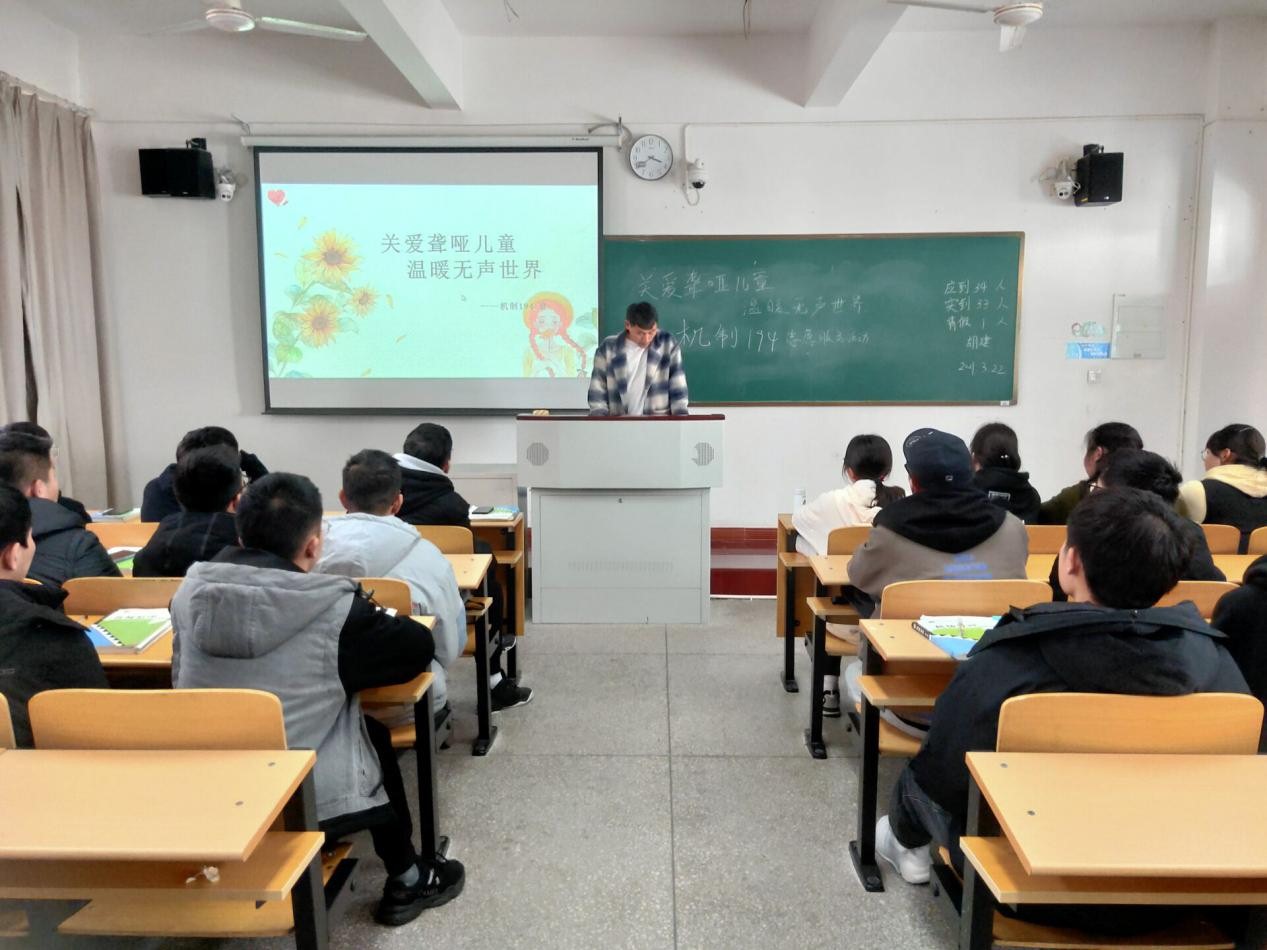 为关爱聋哑儿童,3月21日,机制194班在A110举办关爱聋哑人宣讲活动,机制194班全体成员参加。