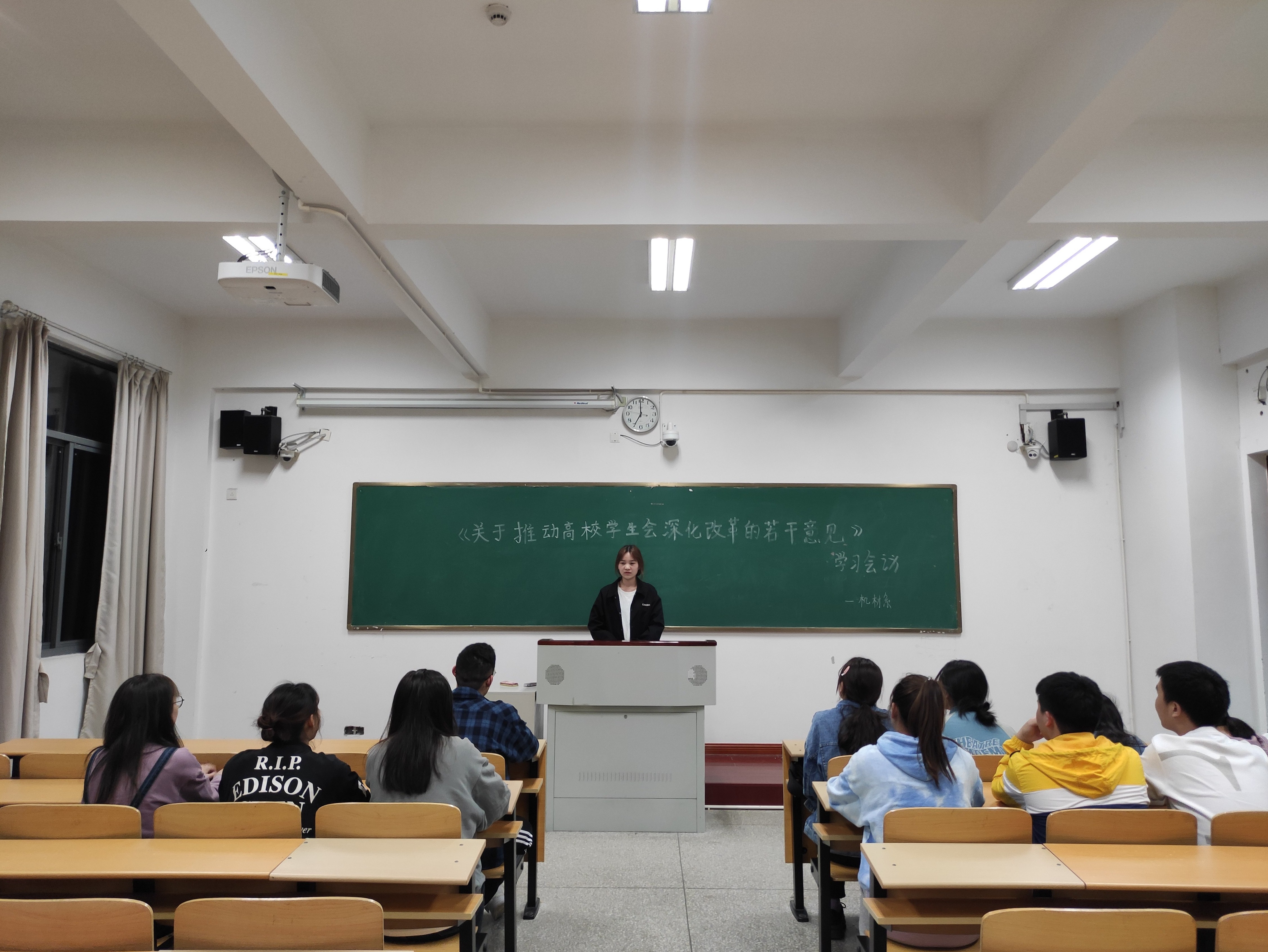 李莎莎向大家介绍了《关于推动高校学生会(研究生会)深化改革的若干意见》文件的八项内容,阐述了学生会的定位和职责,宣扬了学生会的政治性、群众性,并提醒成员们学生会的根本宗旨是为同学服务。