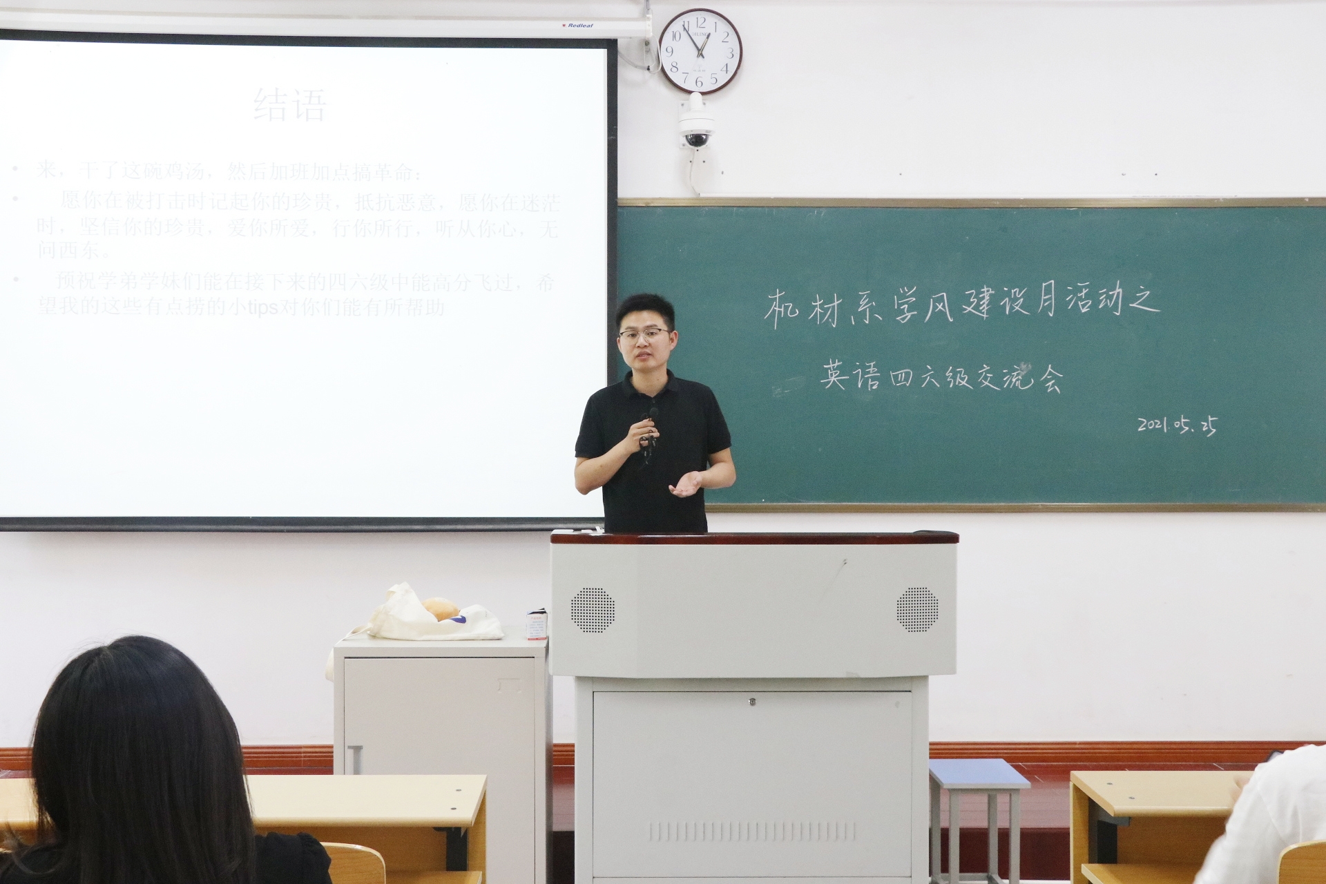 为进一步帮助同学们备考四六级,激发同学们的学习热情。5月25日,机械与材料工程系在A109举办学风建设月活动之英语四六级交流会。机械与材料工程系20级辅导员芮进老师受邀出席本次活动,活动由高分子183潘楚泷和高分子191佴研主讲,大一大二学生参与。