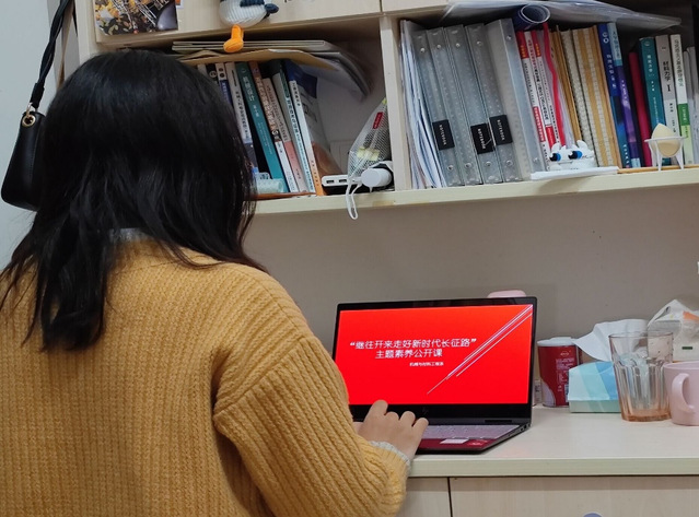 会上,朱潇通过屏幕共享的方式展示PPT和相关视频,生动地描绘了红军长征的艰难困苦,她向同学们传达了在全面建设社会主义现代化国家新征程上,新青年需担当历史使命,掌握历史主动权,以强国复兴为己任的思想。