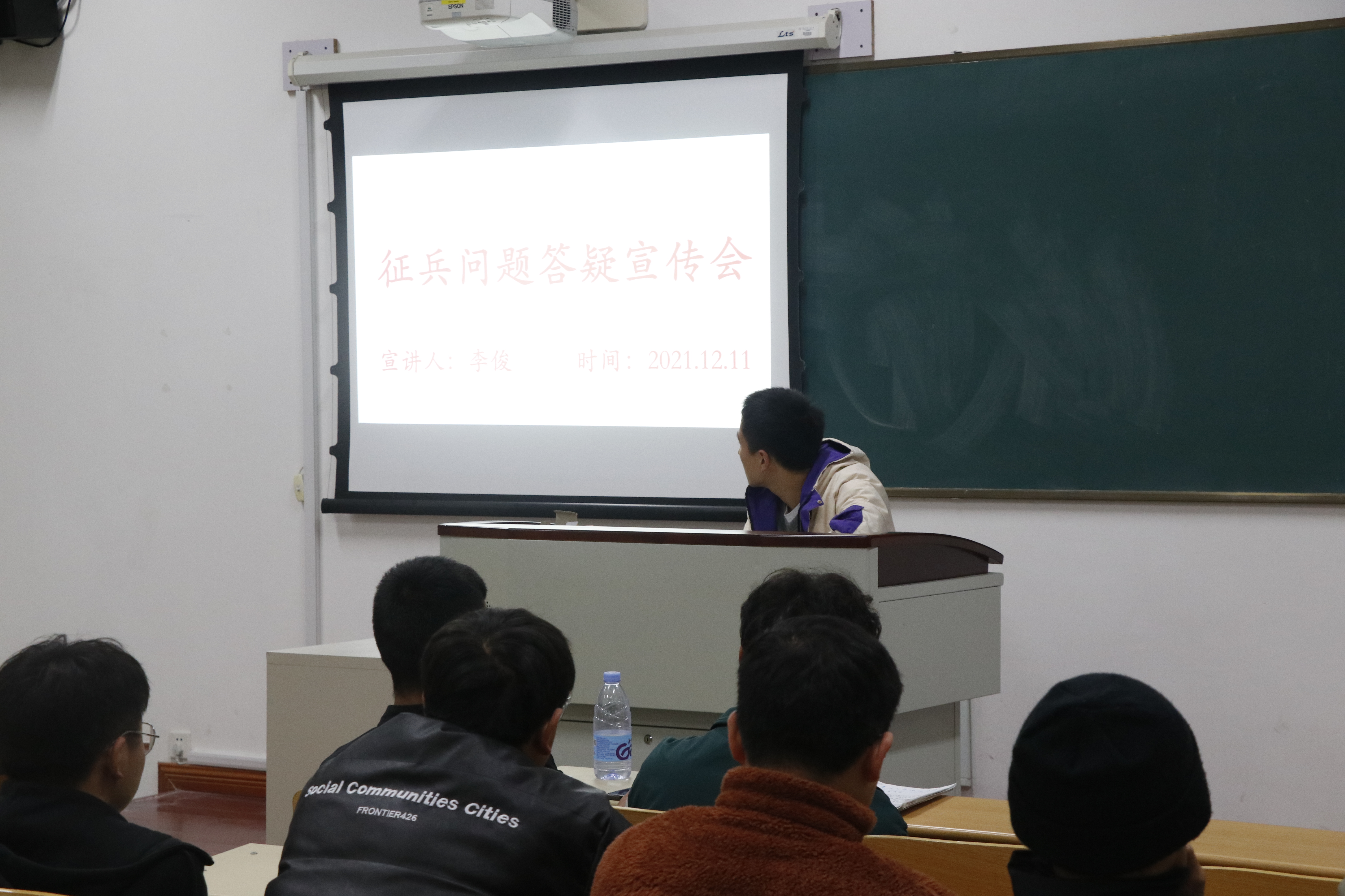 为加强征兵政策宣传,鼓励同学们积极参与应征入伍,12月11日晚,机械与材料工程系于A502顺利召开征兵问题答疑宣传会,本次宣传会由李俊主讲,2021部分新生参加。